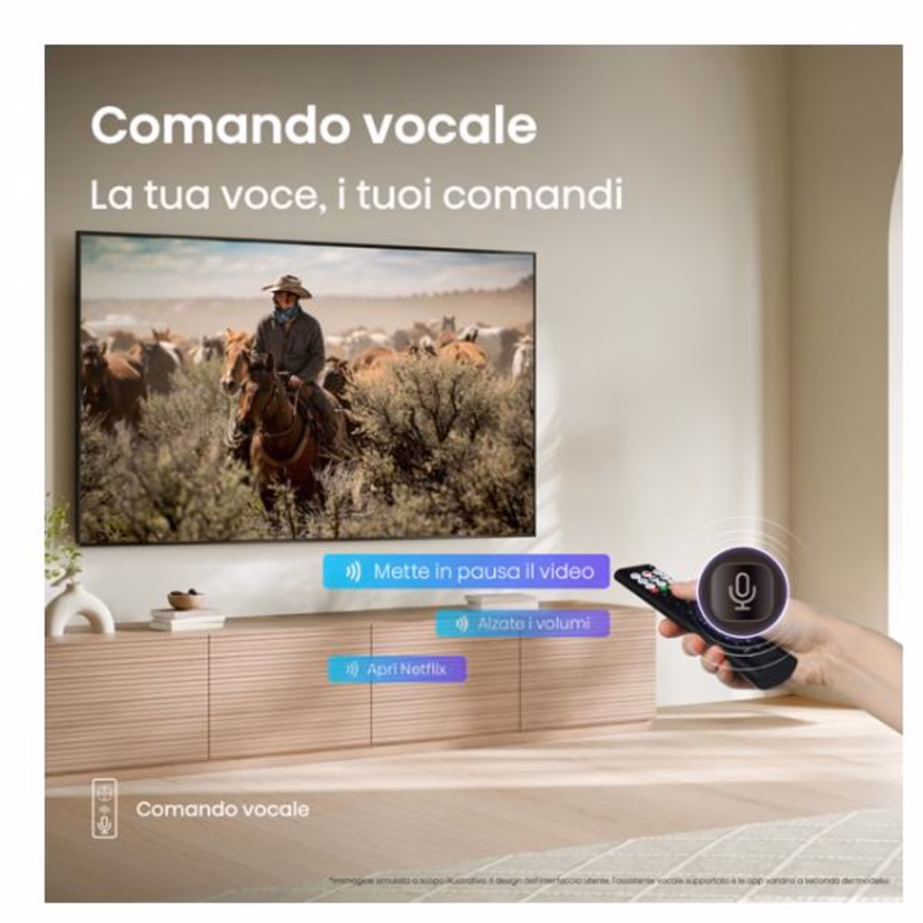 Prova il telecomando vocale Hisense e porta il controllo della TV a un livello superiore di comodità. Premendo un solo pulsante si attivano i comandi vocali. Naviga facilmente tra i programmi, regola il volume o interagisci con gli assistenti virtuali.