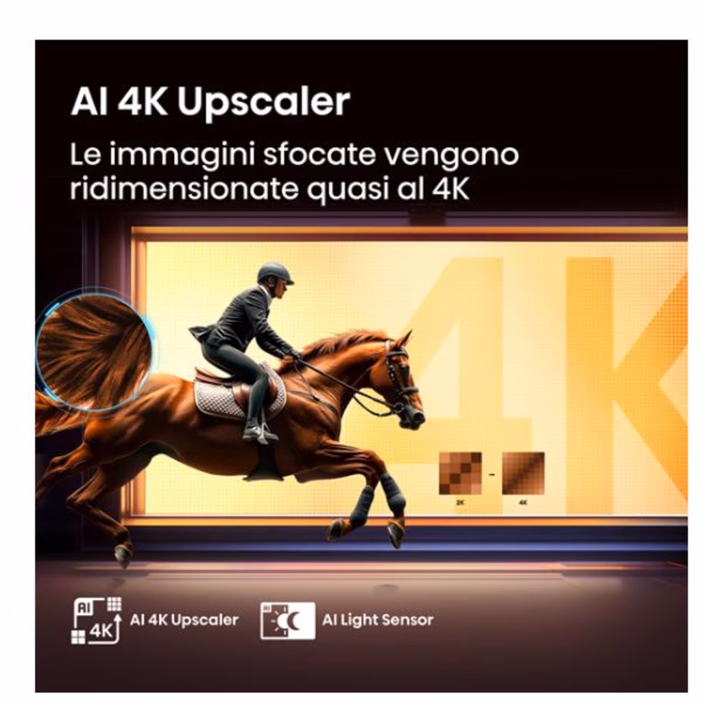 L'Upscaler Al 4K di Hisense sblocca una chiarezza superiore per tutti i tuoi contenuti preferiti. Questa funzione intelligente rimodella non solo i tuoi amati classici e filmati, ma anche le moderne trasmissioni TV, i film e persino i contenuti in streaming in una straordinaria qualità 4K. Ogni pixel viene elevato alla potenza del tuo televisore.