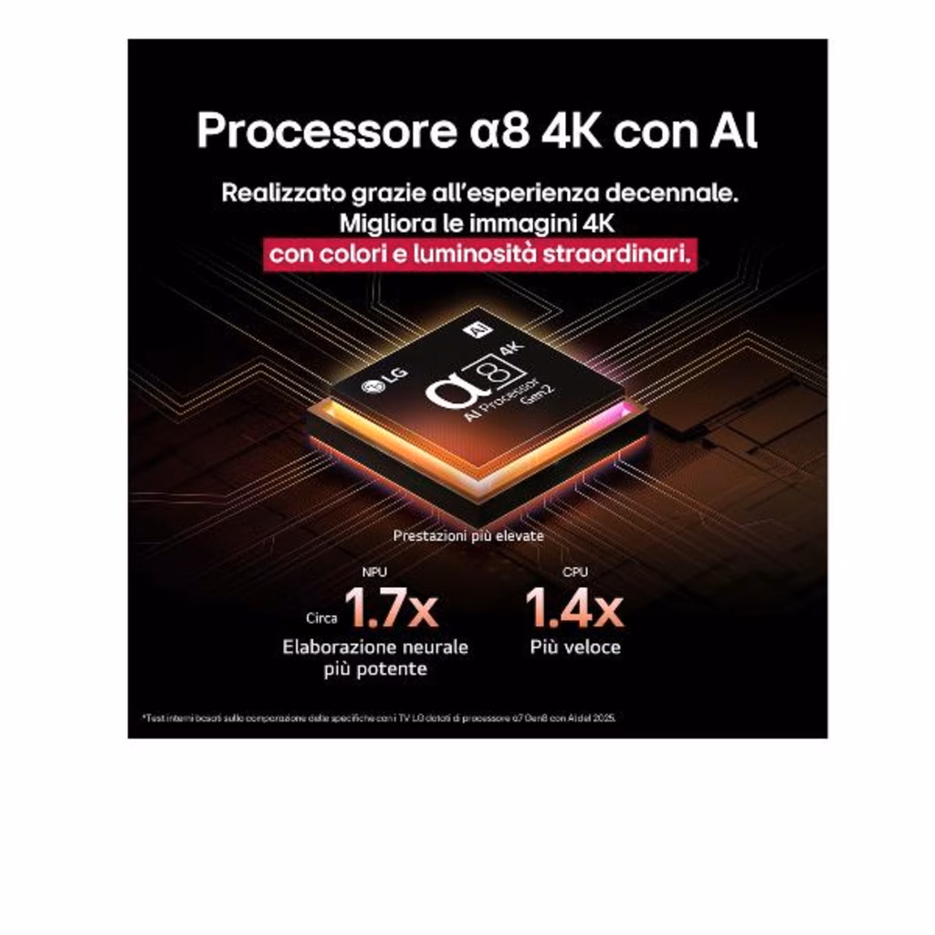 Il processore a8 Gen2 sviluppato da LG è progettato per sfruttare il deep-learning dell'Intelligenza Artificiale per riconoscere ciò che stai guardando e migliorare automaticamente il suono e le immagini fotogramma per fotogramma. Ad esempio, analizza ogni fotogramma per migliorare la risoluzione, ridurre il rumore e, sul fronte audio, offrirti un suono surround virtuale fino a 9.1.2 canali.