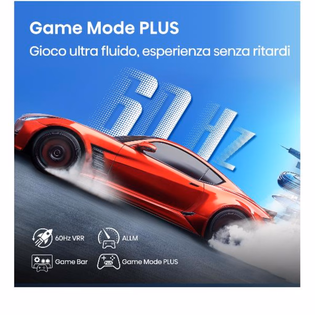 Migliora la tua esperienza di gioco con la modalità di gioco PLUS con una barra di gioco come centro di controllo integrato. VRR e ALLM riducono l'input lag ed eliminano lo screen strappo. Goditi il ??gameplay fluido su una TV a prezzi ragionevoli!