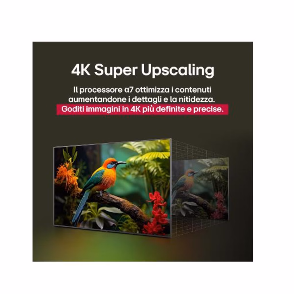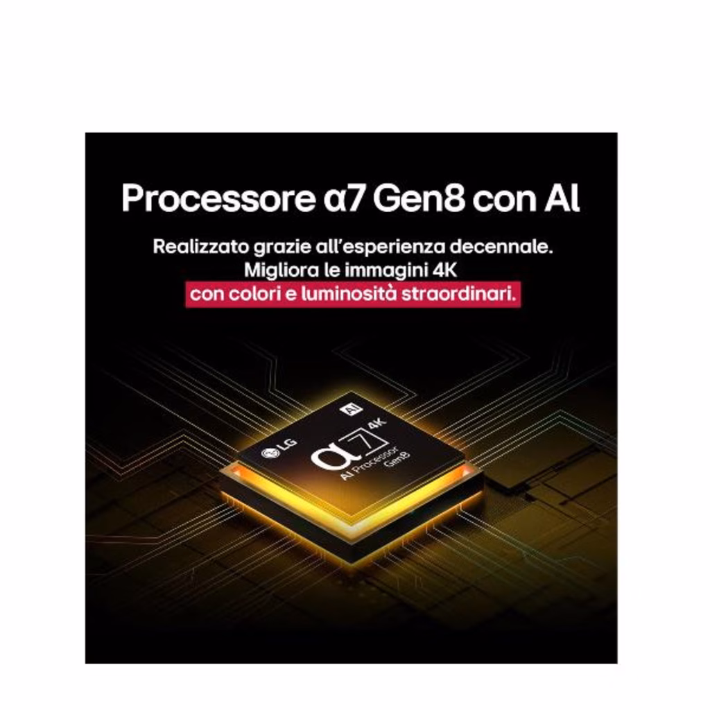 Il nuovo processore a7 Gen8 offre prestazioni superiori rispetto al modello precedente, grazie a una maggiore memoria e a una velocità di elaborazione più elevata. Utilizzando l'Intelligenza Artificiale, ottimizza i contenuti visualizzati sul TV con un'elaborazione accurata delle immagini e del suono. Trasforma i contenuti a risoluzione inferiore in 4K e rende l'audio più avvolgente con 9.1.2 canali virtuali.