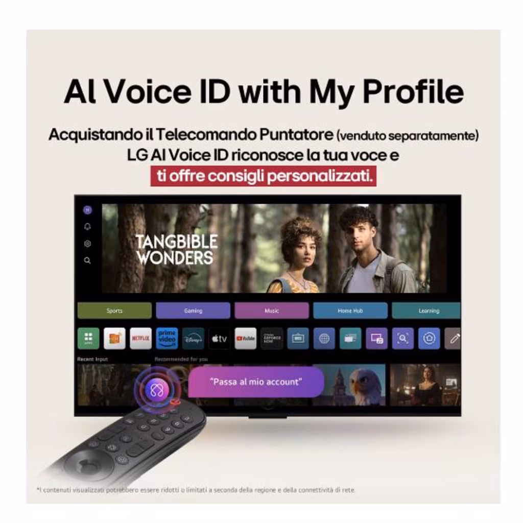 Quando accendi il TV, riconosce automaticamente la tua voce e imposta il tuo profilo per darti un'esperienza personalizzata. Ad esempio, ti consiglia nuovi contenuti da guardare in base alla tua cronologia di visione, imposta la schermata principale con le app che usi di più e ti suggerisce le parole chiave da usare per scoprire nuove funzioni.