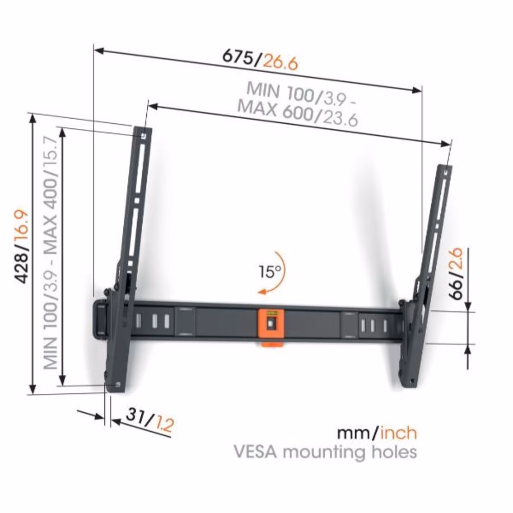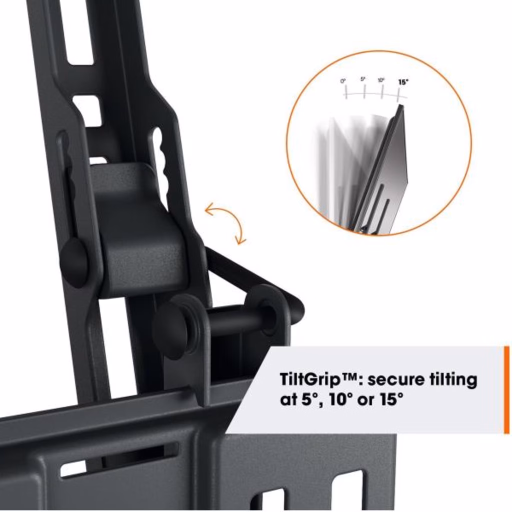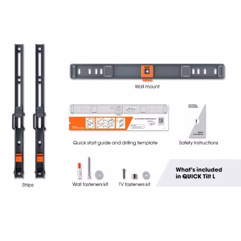 Vuoi appendere la tua TV un po' più in alto alla parete e divertirti comunque a guardarla? Questo supporto da parete per TV QUICK Tilt è esattamente quello che stai cercando. Puoi installarlo in modo estremamente rapido e semplice. In non più di 20 minuti, la tua TV è saldamente in posizione. È quindi possibile inclinare il televisore di 5°, 10° o 15° per impostare l'angolo di visione ideale. Il supporto da parete per TV è adatto per televisori da 40 a 77 pollici e con un peso fino a 35 kg.