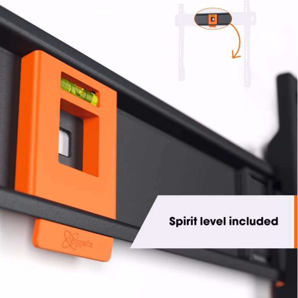 Il supporto da parete per TV QUICK Tilt viene fornito con tutti i materiali di montaggio necessari per iniziare subito: maschera di foratura, viti e spine Fischer® DuoPower. Abbiamo anche pensato di includere una livella a bolla d'aria. È integrato nel supporto a parete per TV QUICK Tilt. Ciò consente di montare il televisore perfettamente dritto. Puoi facilmente contrassegnare il primo foro di perforazione utilizzando la nostra app gratuita DrillRight AR.