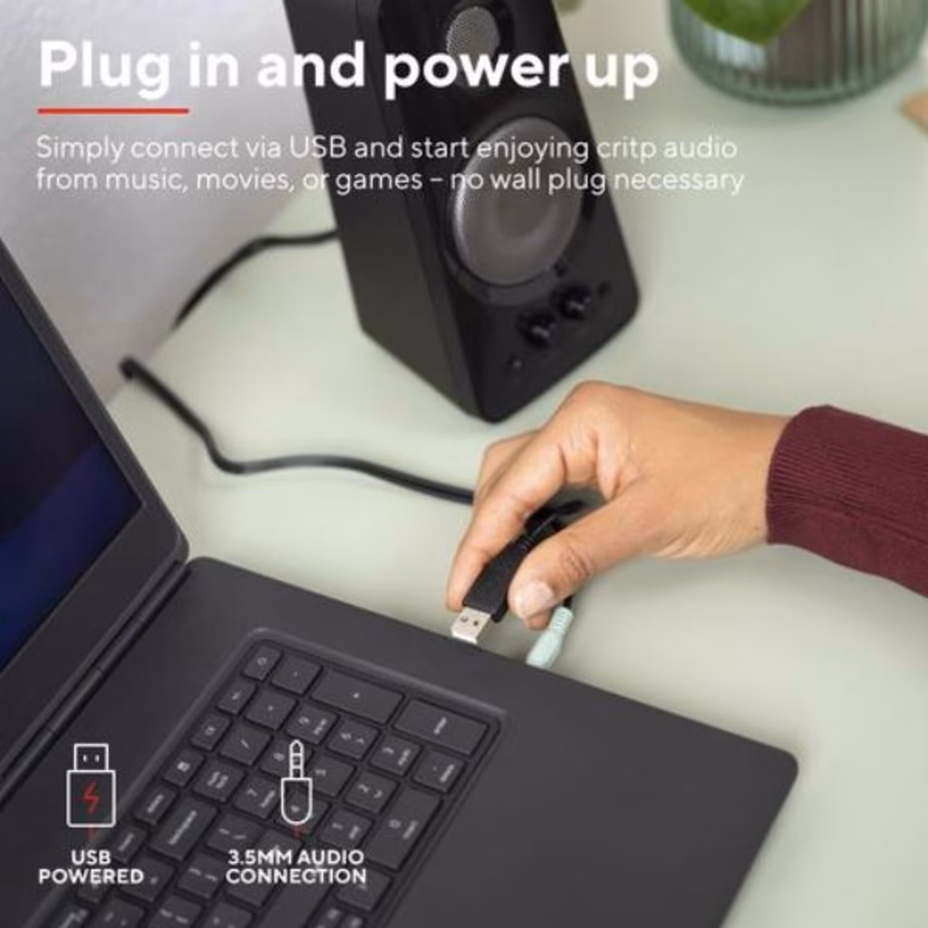 Questo set di altoparlanti si alimenta via USB con il cavo da 155 cm e la sua spina si inserisce senza problemi nel laptop o nel PC. In pratica, non occorre inserire la spina dell altoparlante in una presa di alimentazione a parete. Tale caratteristica, unita al design salvaspazio, consente di collocare questi altoparlanti in qualsiasi punto della casa.