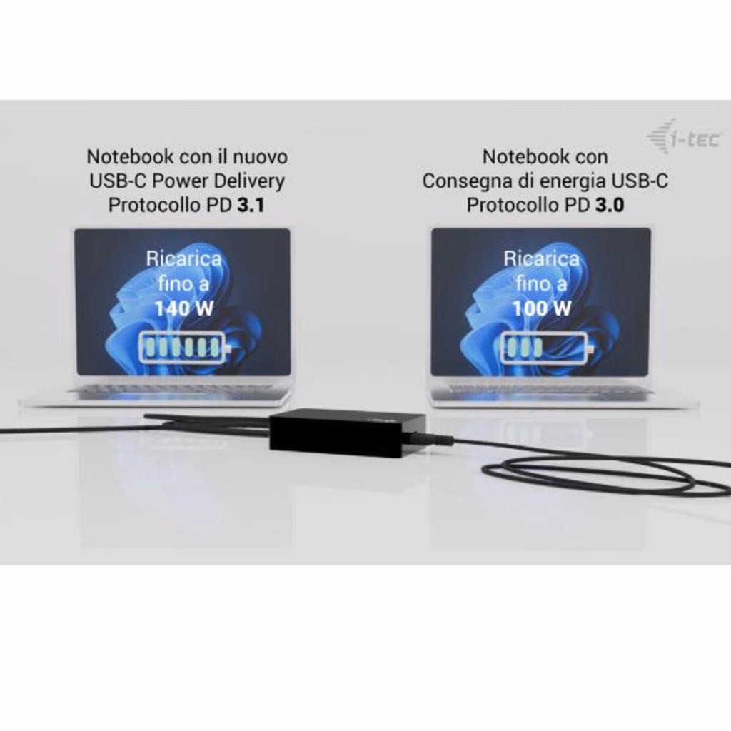 Adattatore di alimentazione USB-C universale da 140 W per l alimentazione di notebook, tablet, smartphone e altri dispositivi dotati di porta di ricarica USB-C Tensione di ingresso AC 100-240 V, 50-60 Hz, max. 1.8 A Potenza di uscita (max.): 140 W (per dispositivi che supportano il protocollo PD 3.1) Efficienza: più dell 83%. Tensione di uscita USB-C: DC 5 V / 9 V / 12 V / 15 V / 20 V / 28 V Corrente di uscita USB-C: max. 5A Potenza di uscita USB-C (max): 140W * Protezione contro sovraccarico di corrente, sovratensione, cortocircuito e surriscaldamento. Temperatura di funzionamento: 0 °C 35 °C Umidità relativa: 10 % 100 % Dimensioni del prodotto: 127 x 70,5 x 30 mm Peso del prodotto: 379 g Requisiti hardware: Dispositivo con una porta USB-C, USB4 o Thunderbolt 3/4/5 libera con supporto Power Delivery * Se il vostro laptop o tablet supporta il nuovo e moderno protocollo di ricarica USB-C Power Delivery PD 3.1, la docking station offrirà una potenza di ricarica fino a 140 W (se avete PD 3.0, la potenza di ricarica sarà di 100 W).
