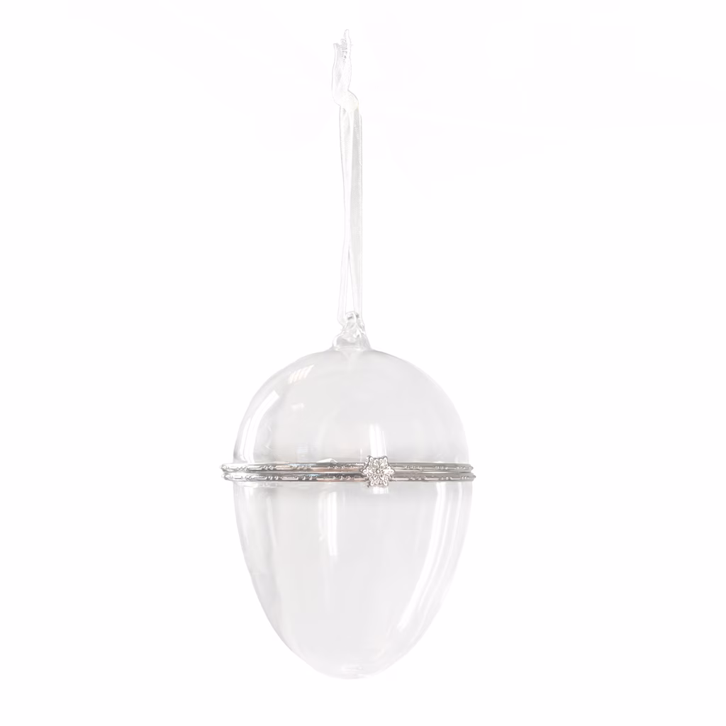 Originale e raffinata pallina contenitore in vetro trasparente con apertura lavorata effetto argento e nastrino per appendere - design dal sapore antico, può essere appesa così comè o riempita da qualsiasi cosa suggerisca la fantasia per arricchire e personalizzare le proprie decorazioni nella forma a uovo - Dimensioni HxØ cm 10,5x8