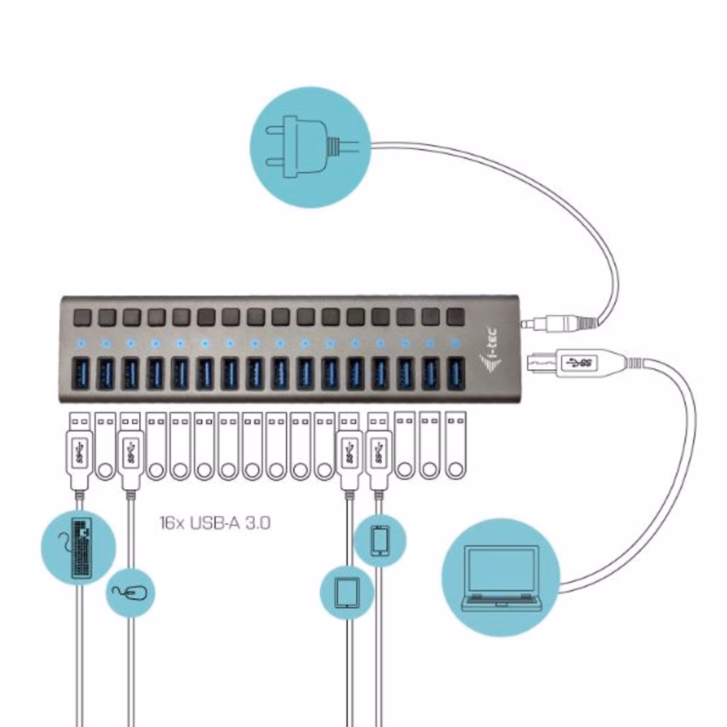Questo HUB offre 16 porte USB 3.0 con funzione Plug&Play e ricarica USB standard. L HUB rileva automaticamente se è stato collegato un dispositivo per la ricarica USB grazie a ciò l HUB ha 16 porte USB 3.0, quindi, è possibile ricaricare 16 dispositivi alla volta. L interfaccia USB 3.0 è importante in particolare per trasmettere dati da chiavette o schede di memoria USB 3.0 siccome raggiunge alte velocità. Utilissimo è anche l adattatore di alimentazione esterno compreso nella confezione senza il quale l HUB non può fare a meno. Questo adattatore garantisce l alimentazione continua tramite le porte USB e la potenza fino a 10 W per una porta.