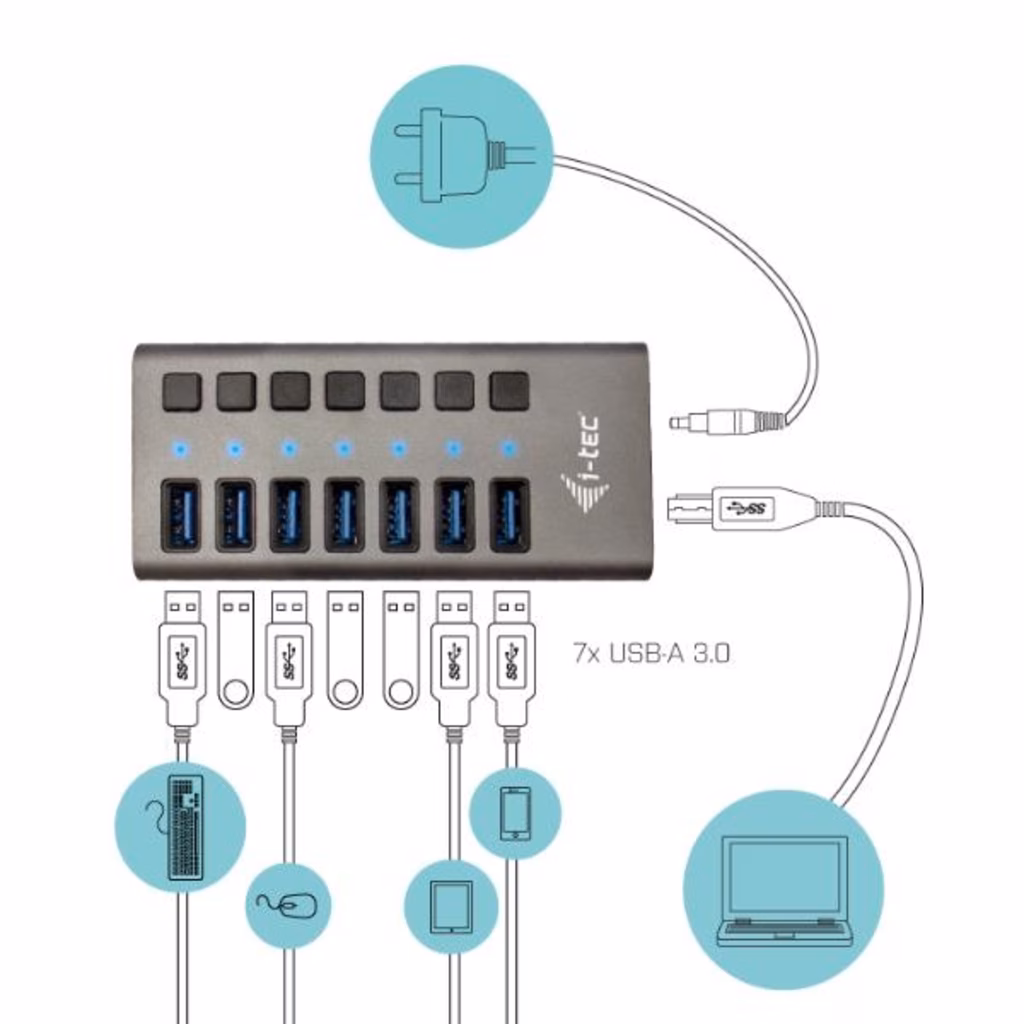 1x porta USB 3.0 per collegare i dispositivi 7x porta USB 3.0 Potenza di ricarica delle porte USB fino a 10 W 1x Ingresso di alimentazione (DC 12V/3A), con spina EU e UK Interruttore ON/OFF per le porte indicatore LED  Cavo USB 3.0 da A a B (100 cm) Protezione contro la sovratensione e la sovracorrente  REQUISITI DI SISTEMARequisiti hardware: Dispositivo con la porta USB-A disponibile Sistema operativo: Windows XP / Vista / 7 / 8 / 8.1 /10/11, macOS X, Linux, Chrome OS