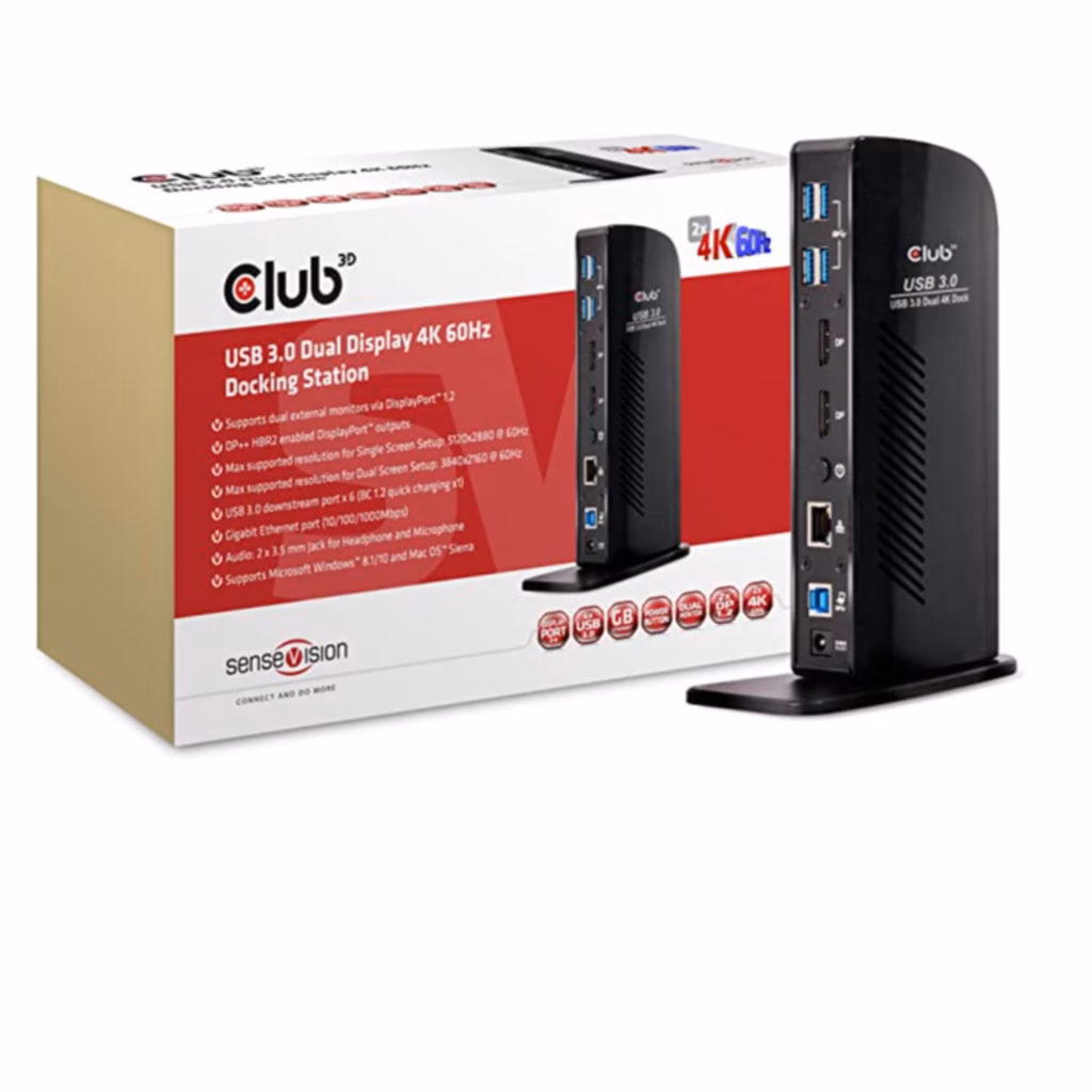 La Docking Station Club3D USB 3.2 Gen 1 Dual Display 4K 60Hz è progettata per soddisfare tutte le tue esigenze di connettività. Fornisce non meno di 6 porte USB 3.0, connessione per cuffie, connessione per microfono, porta Gigabit Ethernet e 2 uscite DisplayPort . Riduce l'ingombro dei cavi e aggiunge porte di connettività dati e display al tuo laptop o ultrabook tramite un'unica porta USB 3.2 Gen 1.