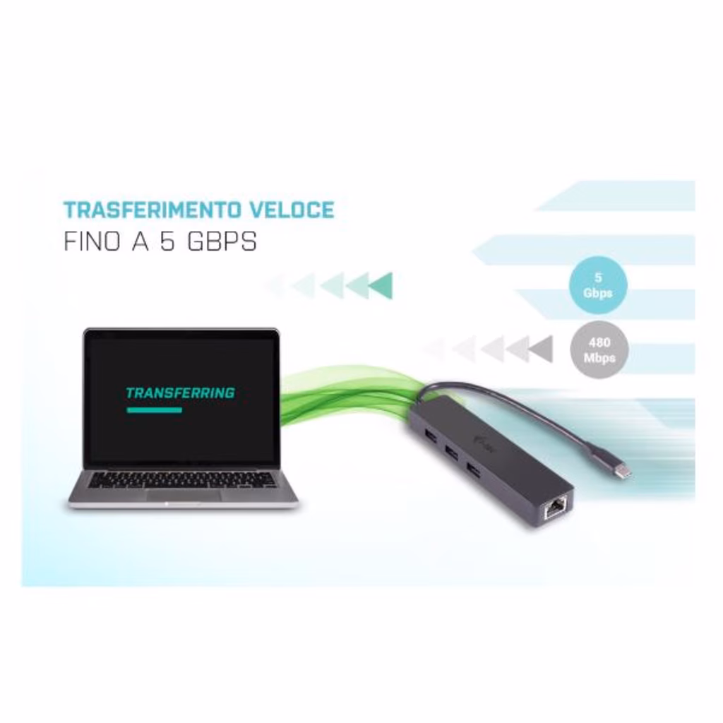 Si tratta di una combinazione dell HUB USB passivo con l adattatore Gigabit Ethernet per il collegamento facile e veloce dei tuoi dispositivi USB preferiti a notebook, tablet, PC o smartphone dotati di un nuovo connettore USB-C o Thunderbolt 3, e per l accesso alla rete internet ad alta velocità tramite il Gigabit Ethernet. 1 porta Gigabit Ethernet consente di accedere facilmente a una rete da 10/100/1000 Mbps. Trasferimento dati veloce USB (fino a 5 Gbps) e LAN (fino a 480 Mbps)