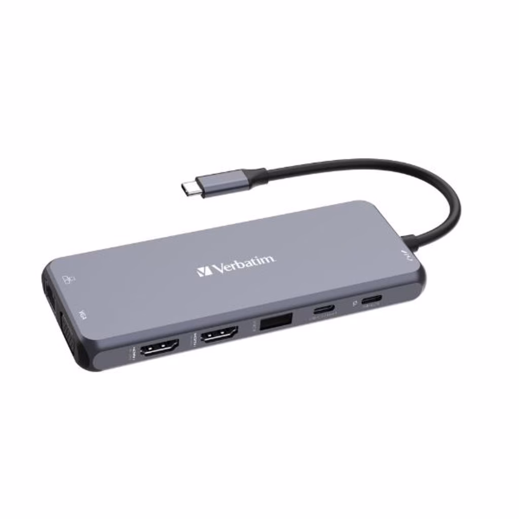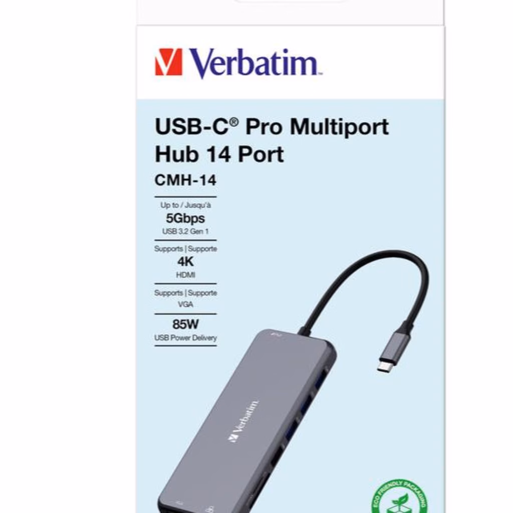 L'hub multiporta USB-C® Pro 14 porte di Verbatim è caratterizzato da un'ampia scelta di connessioni. Grazie alle quattordici porte, tra cui due porte HDMI più una porta VGA per il supporto di monitor legacy, è possibile lavorare e visualizzare in multi-schermo. Le numerose porte USB, tra cui cinque USB-A e due USB-C, tra cui una USB-C PD, forniscono la possibilità di utilizzare dispositivi multipli con il vantaggio di una connessione Internet cablata attraverso la porta gigabit ethernet. Per i fotografi alle prime armi, l'hub prevede sia uno slot per scheda di memoria SD che microSD che consente il trasferimento di foto e video in maniera semplice e veloce. Infine, la porta audio da 3,5 mm consente di utilizzare gli altoparlanti o le cuffie in tutta semplicità e comodità.