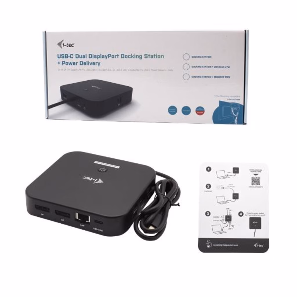 Soecifiche tecniche: 1 cavo USB-C integrato per la connessione al dispositivo (100 cm) Tecnologia della docking station: USB-C (MST) Power Delivery: fino a 100 W Consumo energetico interno: 5-10 W (maggiori informazioni qui) Porte video: 2x DisplayPort (Supporto di DP++) Risoluzione: Dispositivo host con supporto DisplayPort 1.2: 1 monitor 1x DP ? fino a 4K/30Hz 1 monitor 1x DP ? fino a 1080p/120Hz 2 monitor 2 DP ? fino a 2 1080p/60Hz* Dispositivo host con supporto DisplayPort 1.4: 1 monitor 1x DP ? fino a 4K/60Hz 1 monitor 1x DP ? fino a 1440p/144Hz o 1080p/240Hz 2 monitor 2x DP ? fino a 2x 1440p/60Hz* o 2x 4K/30Hz* o 1080p/120Hz* Dispositivo host con DisplayPort 1.4 con supporto DSC: 1 monitor 1x DP ? fino a 5K/60Hz 1 monitor 1x DP ? fino a 4K/144Hz o 1440p/240Hz o 1080p/360Hz 2 monitor 2x DP ? fino a 2x 4K/60Hz* 2 monitor 2x DP ? fino a 2x 1440p/144Hz* 1 porta USB-C Gen. 2 (solo per i dati) 1 porta USB-C Gen. 2 + PD (dati + power delivery) 3 porte USB 3.0 2 porte USB 2.0 1 porta Ethernet GLAN RJ-45 (Realtek RTL8153) 1 porta 3,5mm Combo Audio Clonazione dell indirizzo MAC: Sì (utilizzando il software i-tec Docker Pro) WOL: S1, S2, S3 Indicatore LED Commutatore ON/OFF per accendere e spegnere la docking station Supporto per il Kensington lock OS: Windows 11, Windows 10, macOS*, iPadOS**, Android**, Chrome OS e Linux con gli ultimi aggiornamenti Dimensioni del prodotto: 113 x 113 x 40 mm Peso prodotto: 245 g Dimensioni confezione: 338 x 150 x 55 mm Peso confezione: 458 g * Il sistema operativo macOS non supporta la tecnologia della trasmissione di più schermi video Multi Stream Transport (MST), il che significa che, in caso di connessione a un macOS, su entrambi i monitor sarà visualizzata la stessa immagine. Requisiti hardware: Dispositivo con porta libera USB-C, USB4 o Thunderbolt 3/4 Requisiti Power Delivery: Dispositivo con porta USB-C, USB4 o Thunderbolt 3/4 libera con supporto Power Delivery Requisiti di uscita video: Dispositivo con una porta USB-C o USB4 libera con supporto DisplayPort Alternate Mode o una porta Thunderbolt 3/4 Sistema operativo: Windows 10 / 11, macOS*, iPadOS**, Android**, Chrome OS e Linux con gli ultimi aggiornamenti. * macOS non supporta la tecnologia Multi Stream Transport (MST). Collegando due monitor alla stazione su macOS, entrambi i monitor mostreranno la stessa immagine.** iPadOS e Android non supportano la tecnologia di trasferimento video multischermo, né l opzione schermo esteso. Ciò significa che quando si collega un monitor esterno, verrà visualizzato solo lo schermo specchiato. (Non valido per gli androidi con estensione DEX e Easy Projection). La docking station può essere utilizzata anche senza l adattatore di alimentazione collegato. In questo caso, le uscite video DisplayPort, la porta di rete LAN (RJ-45), l audio / microfono e entrambe le porte USB 2.0 funzioneranno sempre. Tuttavia, le porte USB 3.0 e la porta dati USB-C potrebbero non funzionare quando si collegano dispositivi con requisiti energetici più elevati (come SSD e in particolare unità NVMe). In tal caso si può verificare lo spegnimento della docking station. Per utilizzare tutte le porte e ottenere la massima velocità di trasferimento dei dati, si consiglia di utilizzare la docking station con alimentatore collegato.