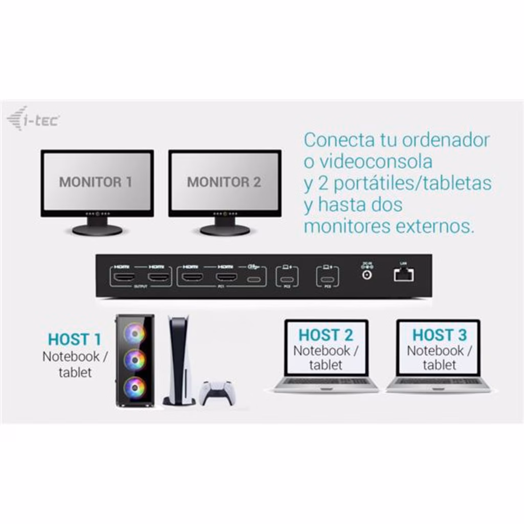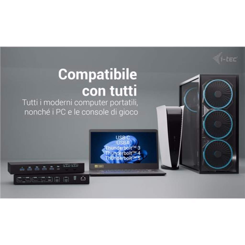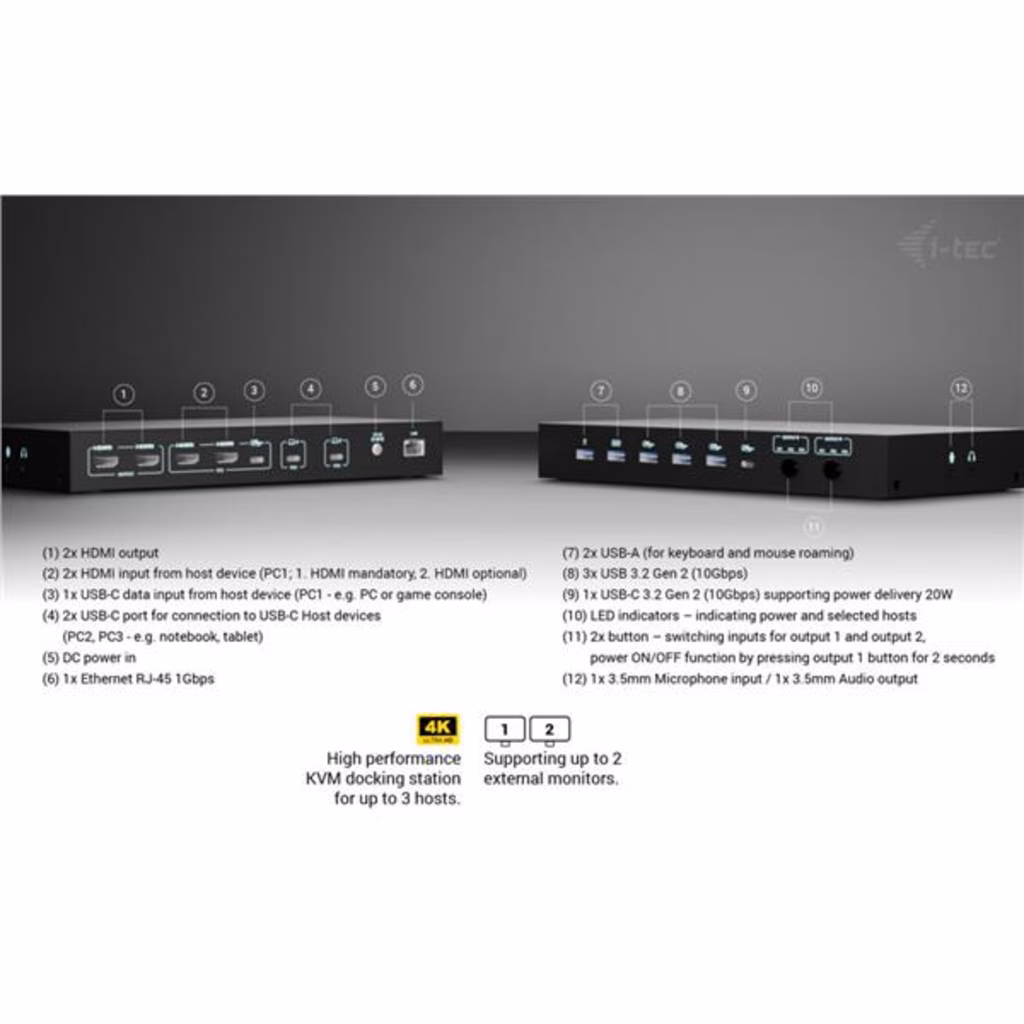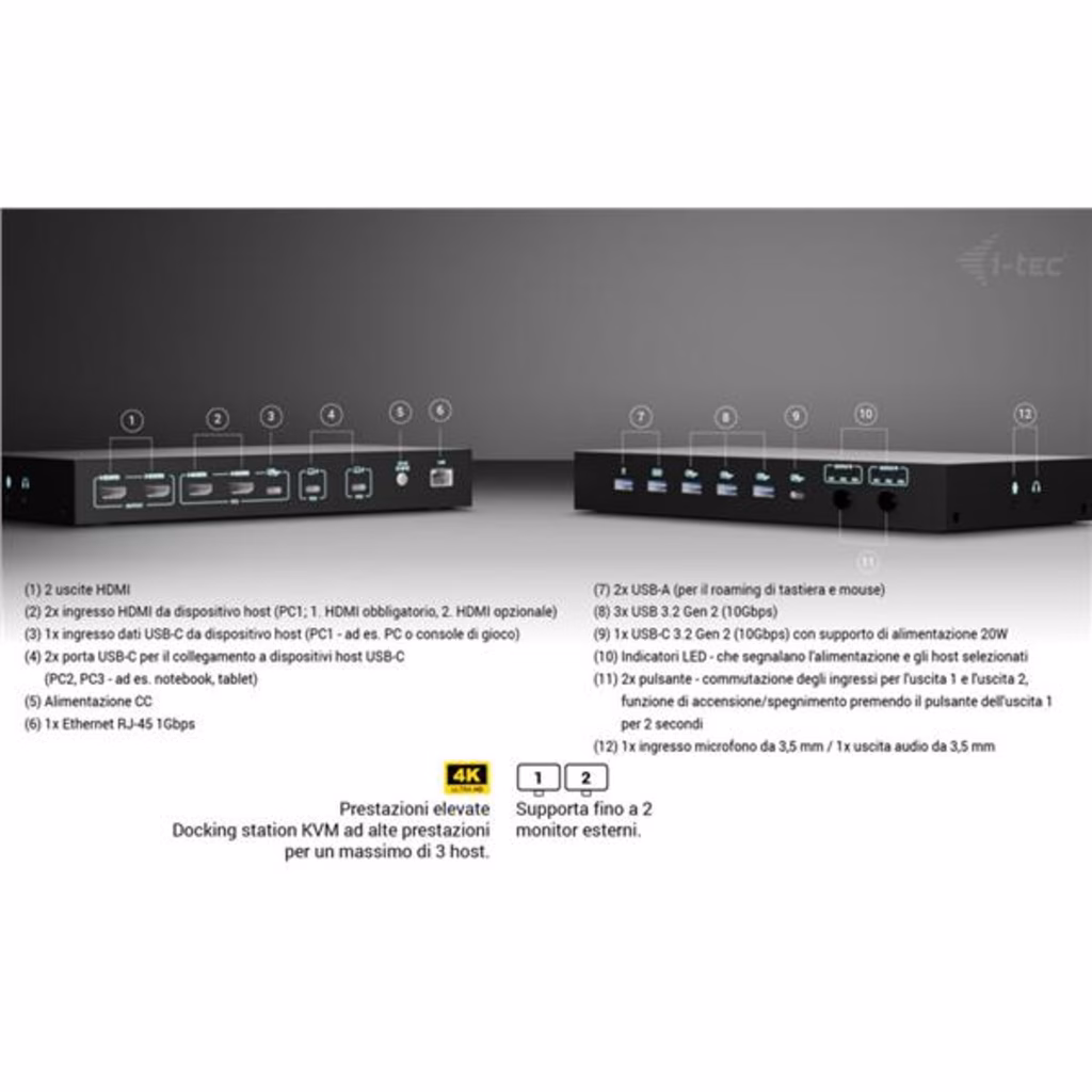 Docking station KVM premium per un massimo di tre dispositiviQuesta docking station ad alte prestazioni consente il collegamento simultaneo di un massimo di tre dispositivi host: un PC o una console di gioco e due notebook o tablet. Completamente compatibile con dispositivi dotati di porte USB-C, USB4 o Thunderbolt 3/4/5. I PC o le console possono essere collegati tramite HDMI e USB.Supporta fino a due monitor esterni, che possono visualizzare contenuti da un unico host o ciascuno da uno diverso, ideale per il multitasking o per lavorare su più sistemi.Grazie a due porte USB roaming, è possibile condividere senza problemi la tastiera e il mouse tra due host contemporaneamente, aumentando il comfort e la produttività.La stazione dispone anche di quattro porte USB ad alta velocità (10 Gbps) per le periferiche, oltre a una connettività completa che include porte GLAN, audio e microfono.L alimentazione intelligente supporta una ricarica fino a 92 W per un singolo laptop o 45 W ciascuno quando si alimentano due dispositivi contemporaneamente.Grazie ai comodi selettori di uscita, è possibile scegliere facilmente se entrambi i monitor devono duplicare un singolo host o funzionare in modo indipendente su due host, ideale per flussi di lavoro paralleli. Supporto per un massimo di 3 dispositivi host esterni (2 laptop/tablet e 1 console di gioco/PC) Collegamento di un massimo di 2 monitor esterni con risoluzione fino a 4K/60 Hz * 2 porte USB intelligenti per tastiera e mouse con funzione di roaming (condivisa) 4 porte USB veloci con velocità di 10 Gbps (3 USB-A e 1 USB-C, che possono anche caricare fino a 15 W) Porta LAN con velocità fino a 1 Gbps (10/100/1000 Mbit) 2 porte da 3,5 mm per audio e microfono Alimentazione 1x 92 W o 2x 45 W 2 pulsanti OUTPUT indipendenti per selezionare il dispositivo host (il pulsante OUTPUT 1 funge anche da interruttore di alimentazione della docking station) * macOS non supporta il Multi-Stream Transport (MST) per l uscita video multi-display. Di conseguenza, quando si utilizza macOS, la stessa immagine verrà riprodotta su entrambi i monitor collegati.