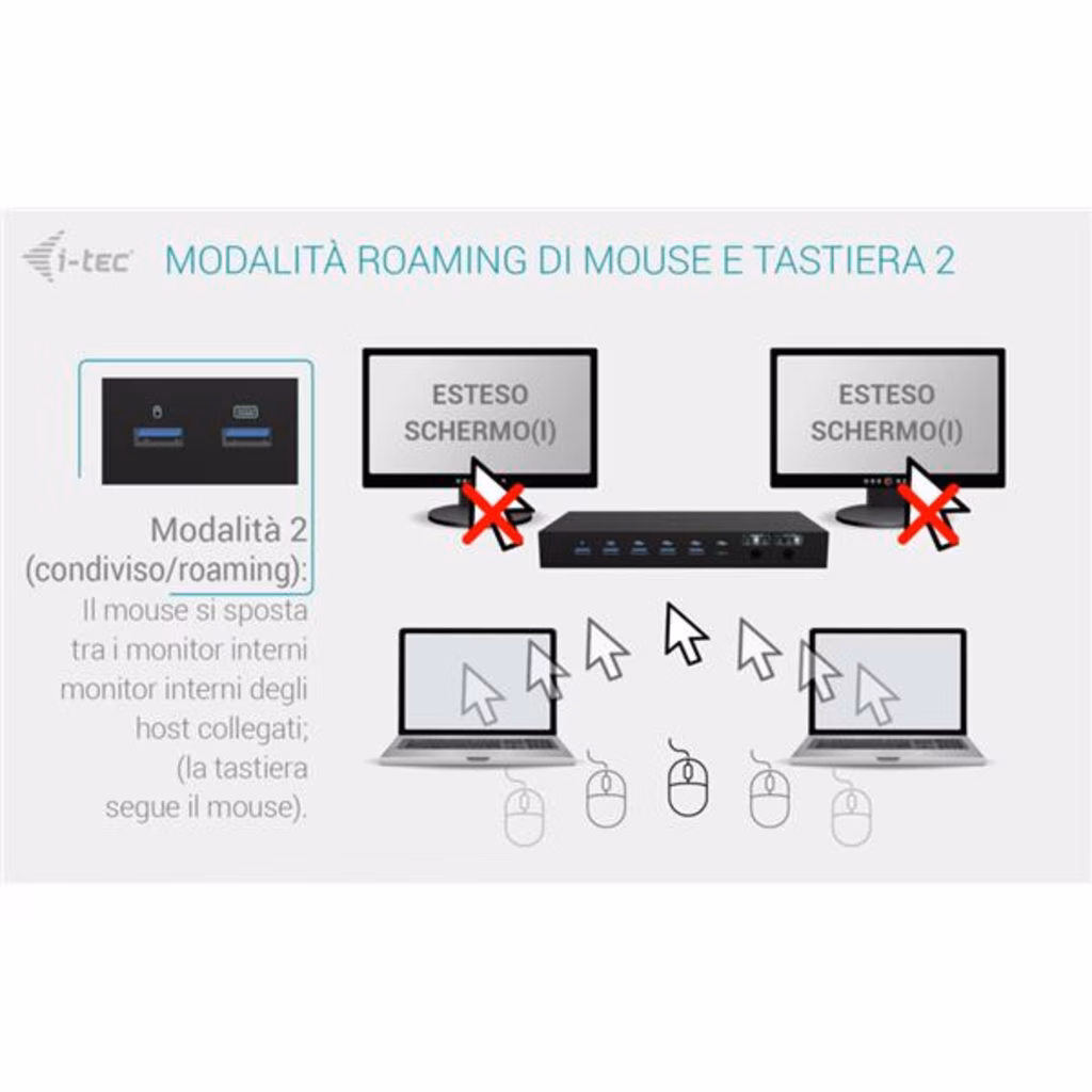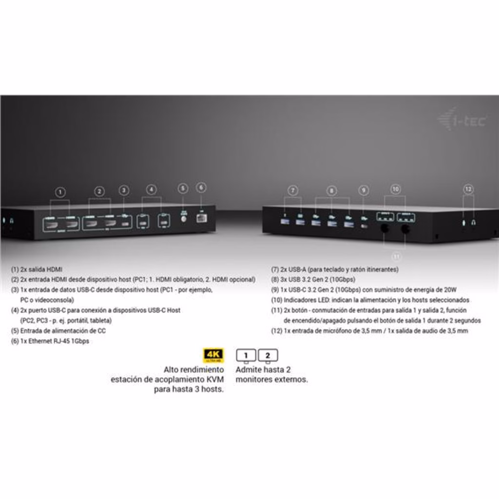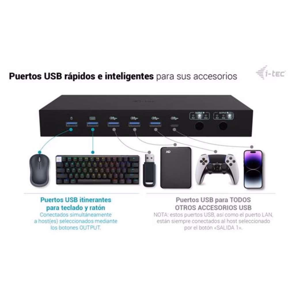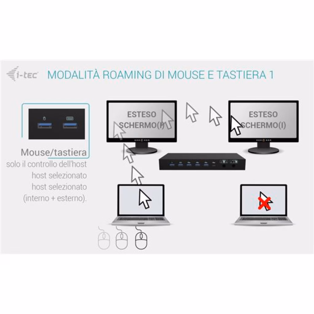 Docking station KVM premium per un massimo di tre dispositiviQuesta docking station ad alte prestazioni consente il collegamento simultaneo di un massimo di tre dispositivi host: un PC o una console di gioco e due notebook o tablet. Completamente compatibile con dispositivi dotati di porte USB-C, USB4 o Thunderbolt 3/4/5. I PC o le console possono essere collegati tramite HDMI e USB.Supporta fino a due monitor esterni, che possono visualizzare contenuti da un unico host o ciascuno da uno diverso, ideale per il multitasking o per lavorare su più sistemi.Grazie a due porte USB roaming, è possibile condividere senza problemi la tastiera e il mouse tra due host contemporaneamente, aumentando il comfort e la produttività.La stazione dispone anche di quattro porte USB ad alta velocità (10 Gbps) per le periferiche, oltre a una connettività completa che include porte GLAN, audio e microfono.L alimentazione intelligente supporta una ricarica fino a 92 W per un singolo laptop o 45 W ciascuno quando si alimentano due dispositivi contemporaneamente.Grazie ai comodi selettori di uscita, è possibile scegliere facilmente se entrambi i monitor devono duplicare un singolo host o funzionare in modo indipendente su due host, ideale per flussi di lavoro paralleli. Supporto per un massimo di 3 dispositivi host esterni (2 laptop/tablet e 1 console di gioco/PC) Collegamento di un massimo di 2 monitor esterni con risoluzione fino a 4K/60 Hz * 2 porte USB intelligenti per tastiera e mouse con funzione di roaming (condivisa) 4 porte USB veloci con velocità di 10 Gbps (3 USB-A e 1 USB-C, che possono anche caricare fino a 15 W) Porta LAN con velocità fino a 1 Gbps (10/100/1000 Mbit) 2 porte da 3,5 mm per audio e microfono Alimentazione 1x 92 W o 2x 45 W 2 pulsanti OUTPUT indipendenti per selezionare il dispositivo host (il pulsante OUTPUT 1 funge anche da interruttore di alimentazione della docking station) * macOS non supporta il Multi-Stream Transport (MST) per l uscita video multi-display. Di conseguenza, quando si utilizza macOS, la stessa immagine verrà riprodotta su entrambi i monitor collegati.