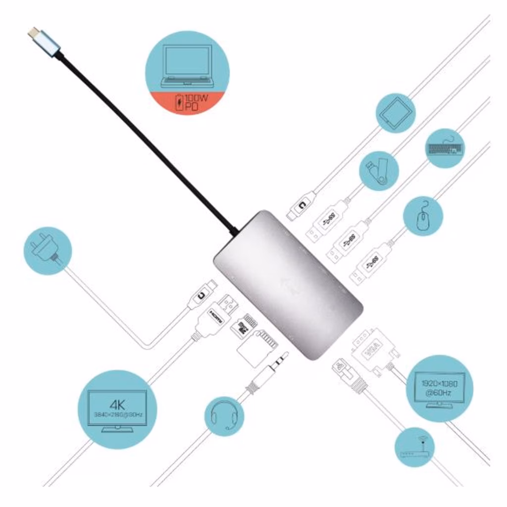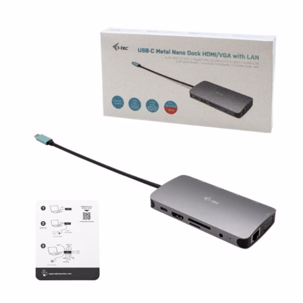 Questo prodotto è un kit, che include una docking station e un alimentatore di ricarica universale. Con l acquisto di kit ottenete una soluzione completa, che Vi consentirà di collegare facilmente i Vostri accessori preferiti, inclusi quelli per le reti LAN ed i monitor esterni, nonché di ricaricare facilmente e comodamente i Vostri dispositivi (incluso il proprio notebook o tablet).STAZIONI DI DOCKINGUna piccola docking station USB-C in metallo capace di collegare un monitor esterno o un proiettore per mezzo della porta HDMI o VGA. Basta semplicemente collegare il vostro notebook o tablet (non è necessario installare i driver) e avrete una rapida trasmissione dati via USB, un collegamento a Internet attraverso la porta LAN con la possibilità di collegare le vostre cuffie e il microfono. Naturalmente il dispositivo supporta l alimentazione del vostro notebook, fino a 100 W, questo significa che potrete caricare i vostri notebook e tablet che supportano l alimentazione tramite USB-C (USB-C Power Delivery).La struttura in alluminio levigato garantisce una resistenza adeguata della docking station anche quando si viaggia spesso. Il cavo USB-C integrato è sufficientemente lungo per un collegamento comodo anche quando la porta USB-C si trova nella parte superiore del telaio del display (come avviene di solito nei notebook/tablet ibridi).La docking station è pienamente compatibile con i notebook e i tablet muniti di una porta Thunderbolt 3.Potete collegare con facilità un monitor esterno di risoluzione fino a 4K/30 HzPower delivery: fino a 100 WDispone di porte HDMI e una porta VGA (entrambi i connettori possono essere collegati contemporaneamente; in questo caso su entrambi i monitor compare la stessa immagine)3 porte USB 3 e 1 porta USB-C vi consentiranno di collegare con facilità i vostri dispositivi e periferiche USB.Lo slot SD e microSD tornerà comodo soprattutto ai proprietari di smartphone e macchine fotografiche digitaliL Ethernet RJ-45 gigabit consente una connessione affidabile, solida e ad alta velocità con supporto delle velocità di 10/100/1000 MbpsJack combinato per audio e microfono sul pannello frontaleSupporta Windows 10, macOS, Android, Chrome OS e LinuxADATTATORE DI ALIMENTAZIONE UNIVERSALEComprare questo adattatore di alimentazione universale USB-C con potenza di 100 W è una scelta giusta per poter alimentare quasi tutti i notebook e altri dispositivi che supportano la funzione Power Delivery, sono dotati di connettore USB-C e richiedono la potenza massima assorbita di 100 W. Il valore di tensione della porta USB Power Delivery 2.0 v 1.2 con la corrente massima di 5 A viene impostato automaticamente nei seguenti profili: 5 V / 9 V / 12 V / 15 V / 19 V / 20 V. Questo adattatore di alimentazione universale è leggero, quindi, facilmente trasportabile ed è dotato di protezione da sovraccarico, sovratensione, surriscaldamento e corto circuito.Specifiche tecniche:STAZIONI DI DOCKING1 cavo USB-C integrato per collegare il dispositivo (30 cm)Tecnologia di stazione dock: USB-CPower Delivery: 100 WPorte video: 1 porta VGA, 1 porta HDMIRisoluzione:Dispositivo host con supporto DisplayPort 1.2:1 monitor 1x HDMI ? fino a 4K/60Hz1 monitor 1x HDMI ? fino a 1080p/120Hz1 monitor 1x VGA ? fino a 1080p/60Hz1 porta USB-C gen. 1 (solo per i dati)1 porta USB-C PD (solo power delivery)3 porte USB 3.1 gen. 11 porta Ethernet GLAN RJ-45 (Realtek RTL8153)1 porta 3,5mm Combo Audio1 slot SD / microSDClonazione dell indirizzo MAC: Sì (utilizzando il software i-tec Docker Pro)WOL: S1, S2, S3Indicatore LEDOS: Windows 10/11, macOS*, iPadOS**, Android**, Chrome OS e Linux con gli ultimi aggiornamentiDimensioni del prodotto: 115 x 60 x 18 mmPeso del prodotto: 100 gDimensioni confezione: 191 x 97 x 23 mmPeso confezione: 134 g Requisiti hardware:Dispositivo con porta libera USB-C, USB4 o Thunderbolt 3/4Requisiti per la funzione Power Delivery:Dispositivo con una porta USB-C, USB4 o Thunderbolt 3/4 libera con supporto Power DeliveryRequisiti per l uscita video:Dispositivo con una porta USB-C o USB4 libera con supporto DisplayPort Alternate Mode o una porta Thunderbolt 3/4Sistema operativo:Windows 10 / 11, macOS*, iPadOS**, Android**, Chrome OS e Linux con gli ultimi aggiornamenti. ** iPadOS e Android non supportano la tecnologia di trasferimento video multischermo, né l opzione schermo esteso. Ciò significa che quando si è collegati a un monitor esterno, verrà visualizzato solo lo schermo specchiato. (Non valido per gli androidi con estensione DEX e Easy Projection) ADATTATORE DI ALIMENTAZIONEAdattatore di alimentazione universale a 100 W USB-C per ricaricare notebook, tablet, smartphone e altri dispositivi dotati di porta di alimentazione USB-CTensione d ingresso AC 100/240 V, 50/60 Hz, mass. 1.3 APotenza d uscita (mass.): 100 WRendimento: più dell 86%Tensioni d uscita porta USB-C: 5 V / 9 V / 12 V / 15 V / 19 V / 20 V DCCorrente d uscita porta USB-C: mass. 5 APotenza d uscita USB-C (mass.): 100 WProtezioni installate: sovraccarico, sovratensione, surriscaldamento e corto circuitoTemperatura d esercizio: 0 40 oCUmidità relativa: 10 100%Dimensioni prodotto: 162 x 45 x 30 mmPeso prodotto: 310 g