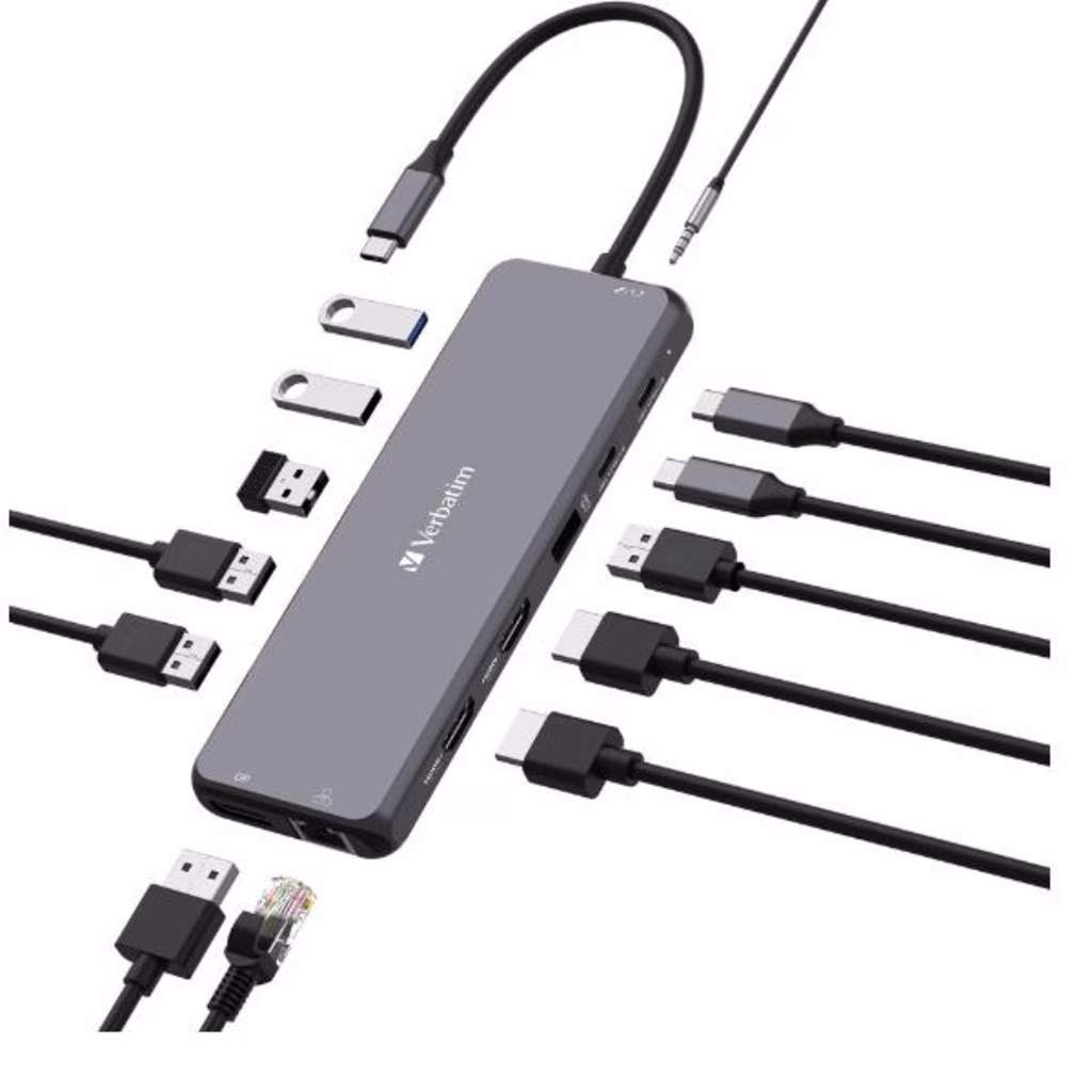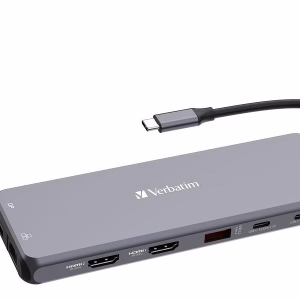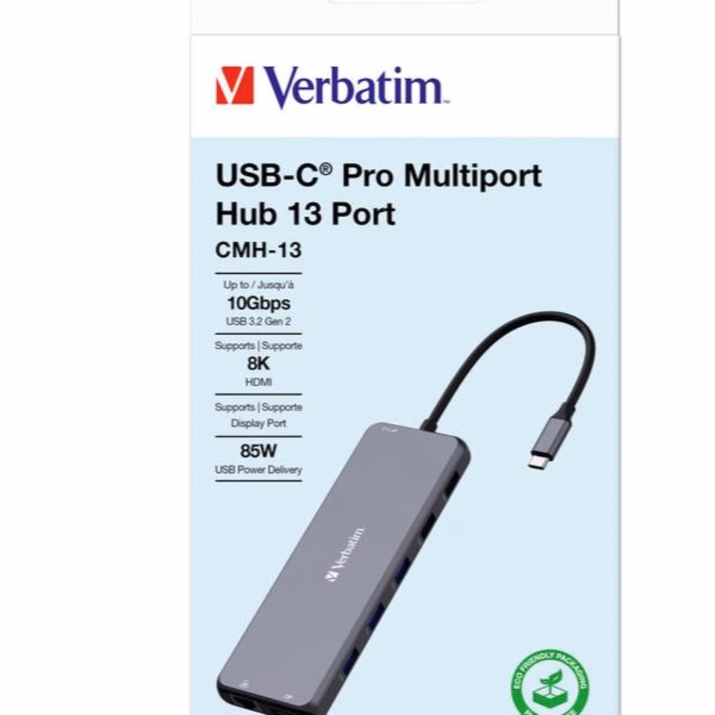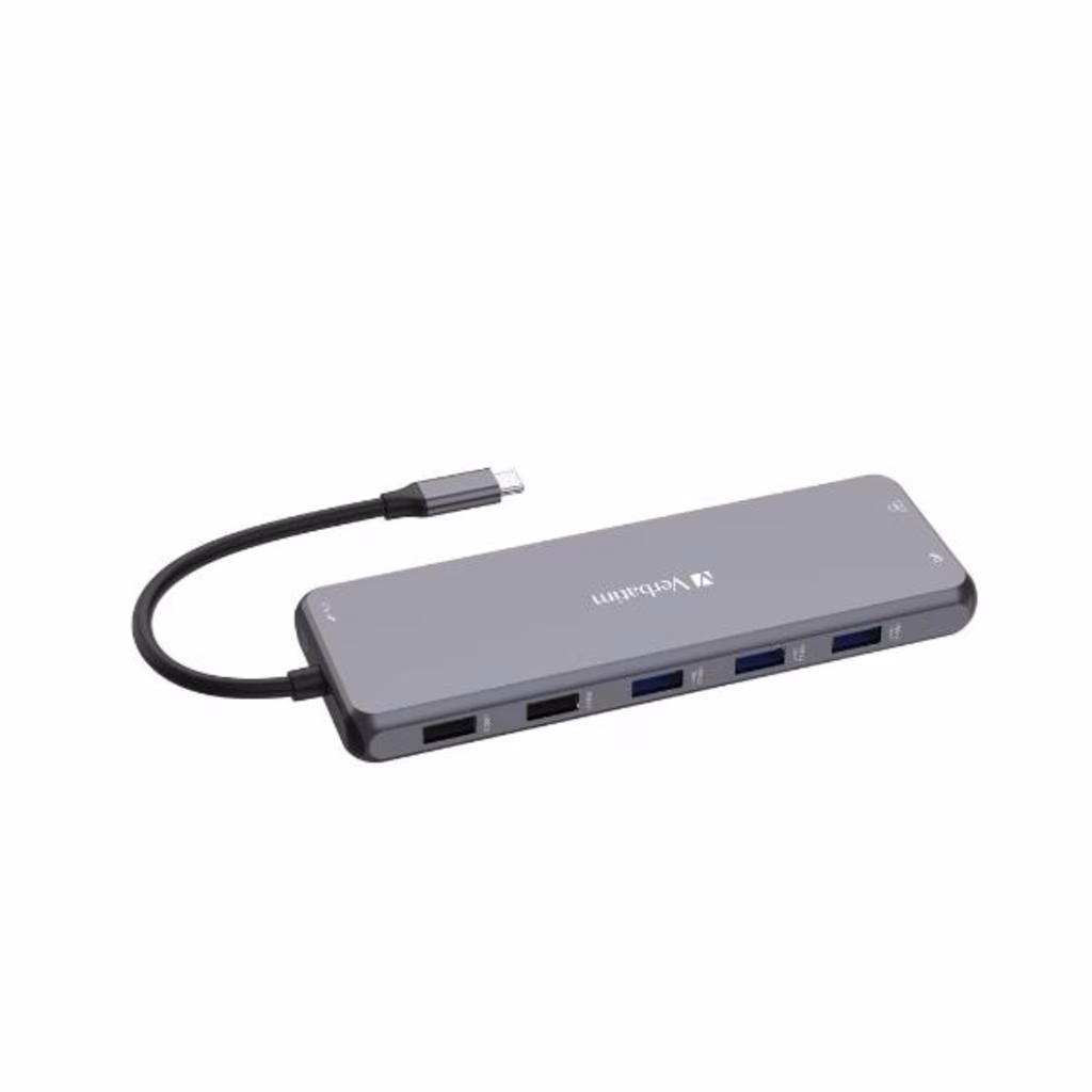 L'hub multiporta USB-C® Pro 13 porte di Verbatim è caratterizzato da un'ampia gamma di opzioni di connettività, tra cui due porte HDMI e una DisplayPort per operare su tre schermi. Ideale per editor e creativi, la porta gigabit ethernet fornisce la capacità di beneficiare della velocità di una connessione Internet cablata, mentre la porta audio permette il collegamento di altoparlanti o cuffie. Sono disponibili ben sei porte USB-A di generazioni differenti che supportano dispositivi di velocità diverse e due porte USB-C PD (Power Delivery) per assicurare che i tuoi dispositivi restino sempre carichi.