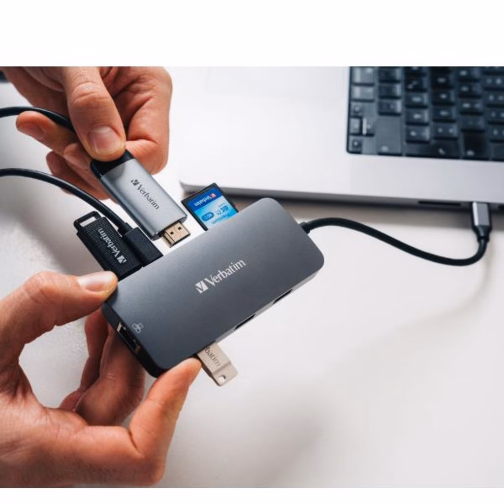 L'hub multiporta USB-C® Pro 9 porte di Verbatim offre nove porte versatili che includono generazioni differenti di USB-C e USB-A garantendo la massima compatibilità con i dispositivi. Immergiti nell'uscita video 4K grazie alla porta HDMI, sfrutta le velocità offerte da una connessione Internet via cavo con la porta gigabit ethernet e trasferisci foto e dati rapidamente e facilmente grazie agli slot per scheda di memoria SD e microSD. L'hub è caratterizzato da due porte USB-C e una porta USB-A a velocità fino a 10Gb/s e da due porte USB-A a velocità fino a 5Gb/s che garantiscono la massima connettività del dispositivo.