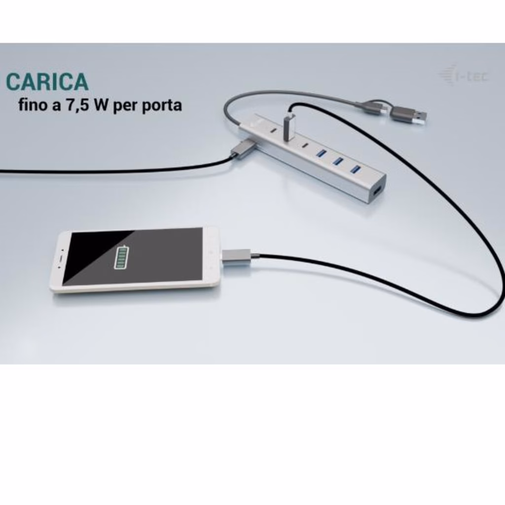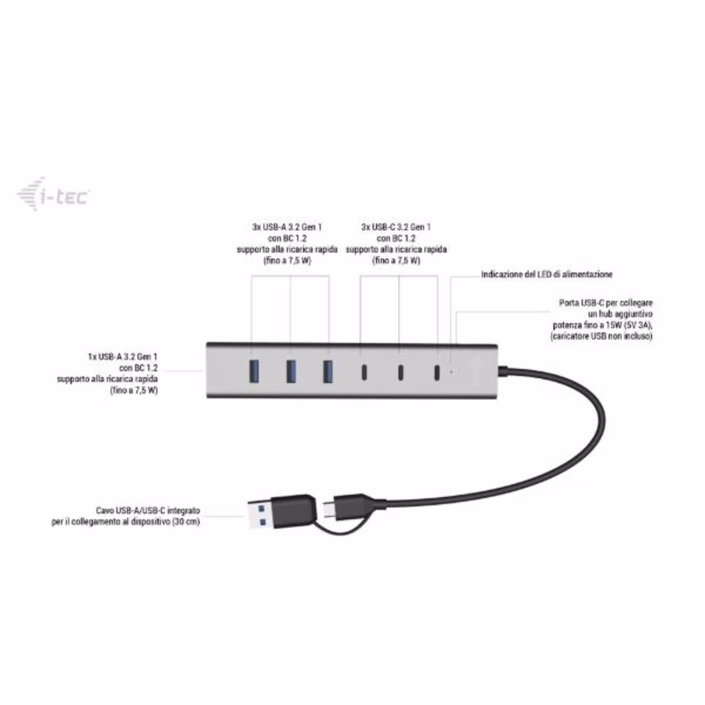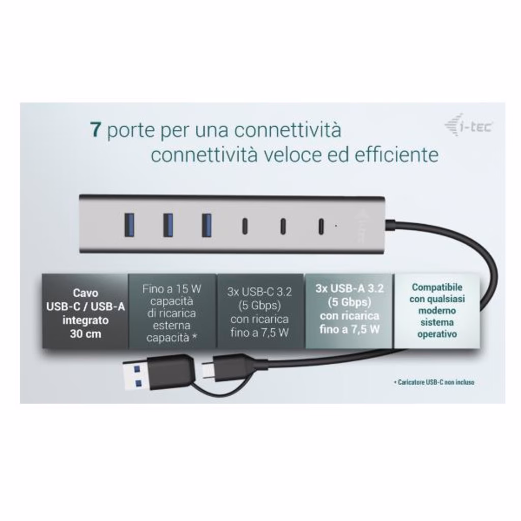Le porte USB-A, USB-C, USB4 e Thunderbolt 3 o 4 sono sempre più diffuse nei computer portatili e nei tablet di oggi. Con l aumento del loro utilizzo, il numero di porte USB sul corpo dei computer portatili sta diminuendo. Se avete bisogno di collegare accessori al vostro dispositivo che non dispone più di porte sufficienti, potete utilizzare questo piccolo ma pratico hub che supporta anche la ricarica attiva.Questo hub offre 7 porte USB aggiuntive (4x USB-A e 4x USB-C). Collegate una tastiera e un mouse esterni, trasferite dati o filmati da un unità flash USB fino a 5 Gbps o ricaricate i vostri dispositivi mobili fino a 7,5W.L Hub non richiede l installazione di driver, basta collegarlo con il cavo USB-C o USB-A per iniziare a usarlo subito. L hub è dotato di una protezione integrata contro le sovratensioni per il computer in caso di cortocircuito delle periferiche. Grazie alle sue dimensioni compatte e alla sua leggerezza, è possibile portarlo sempre in borsa; la superficie metallica protegge l hub da danni e graffi.L hub supporta la ricarica tramite un adattatore esterno USB-C fino a 15W (5V, 3A)*.* L adattatore non è incluso. 1x cavo USB-A/USB-C integrato per il collegamento al dispositivo (30 cm) 1x porta USB-C per collegare un hub di alimentazione supplementare fino a 15W (5V 3A)*. 3x USB-C 3.2 Gen 1 con supporto alla ricarica rapida BC 1.2 (fino a 7,5W per porta) 4x USB-A 3.2 Gen 1 con supporto alla ricarica rapida BC 1.2 (fino a 7,5W per porta) Indicazione LED di alimentazione dell HUB SISTEMA OPERATIVO: Windows 10/11, macOS, Android, Chrome OS, iPadOS e Linux con gli ultimi aggiornamenti Dimensioni del prodotto: 157 x 30 x 21 mm Peso del prodotto: 78 g * Caricatore USB non inclusoRequisiti hardware: Dispositivo con porta libera USB-A, USB-C, USB4 o Thunderbolt 3/4 Sistema operativo: OS: Windows 10/11, macOS, Android, Chrome OS, iPadOS e Linux con gli ultimi aggiornamenti