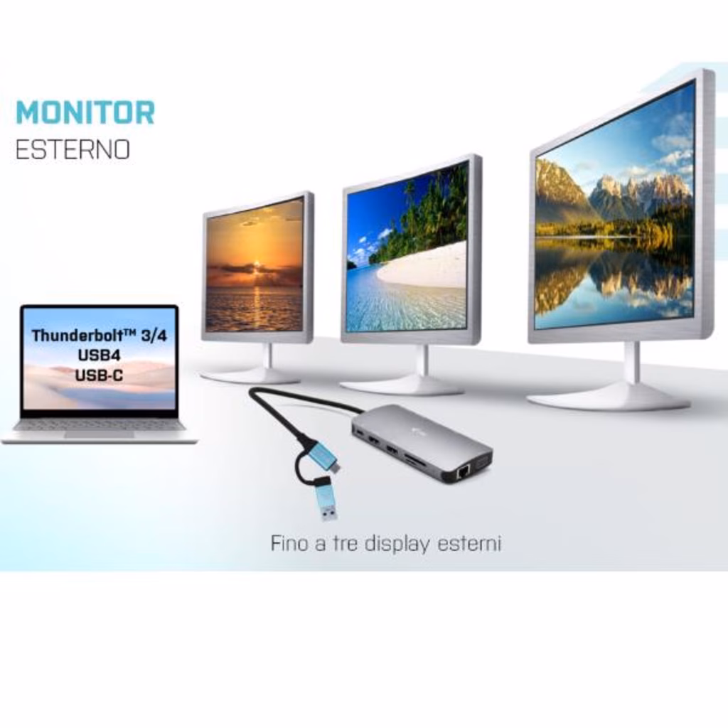 Specifiche tecniche: Il cavo USB-C integrato da 30 cm include l adattatore da USB-C a USB 3.0 Tecnologia di stazione dock: DisplayLink + USBC DP Alt mode + USB-C PD Power delivery: 100 W Porte video: 2x HDMI* 1x VGA Risoluzione: 1 monitor HDMI 1 ? fino a 4K/30Hz 1 monitor HDMI 1 ? fino a 1080p/120Hz 1 monitor HDMI 2 ? fino a 1080p/60Hz 1 monitor 1x VGA ? fino a 1080p/60Hz 2 monitor HDMI 1 + HDMI 2 ? fino a 4K/30Hz + 1080p/60Hz 2 monitor HDMI 1 + VGA ? fino a 4K/60Hz + 1080p/60Hz 2 monitor HDMI 2 + VGA ? fino a 2x 1080p/60Hz 3 monitor HDMI 1 + HDMI 2 + VGA ? fino a 4K/30Hz e 2x 1080p/60Hz 1 porta USB-C 3.2 Gen. 1 (solo dati) 1 porta USB-C PD (solo alimentazione) 1 porta USB-A 3.2 Gen. 1 3x USB-A 2.0 1x slot SD 1x slot microSD 1x porta Ethernet GLAN RJ-45 (DL 3900) Clonazione dell indirizzo MAC: Sì (utilizzando il software i-tec Docker Pro) WOL: S1, S2, S3 Indicazione a LED OS: Windows 10/11, macOS, Linux, Android, ChromeOS con gli ultimi aggiornamenti Facile installazione del driver (Windows, macOS, Ubuntu, Android) Dimensioni del prodotto: 127 x 60 x 18 mm Peso del prodotto: 122 g Dimensioni della confezione: 190 x 98 x 23 mm Peso della confezione: 140 g  Requisiti hardware: Dispositivo con porta libera USB-A, USB-C, USB4 o Thunderbolt 3/4 Requisiti Power Delivery: Dispositivo con una porta USB-C, USB4 o Thunderbolt 3/4 libera con supporto Power Delivery Requisiti per l uscita video della porta HDMI 1: Dispositivo con una porta USB-C o USB4 libera con supporto per la modalità alternativa DisplayPort o una porta Thunderbolt 3/4 Sistema operativo: Windows 10 / 11, macOS, Android 5 o successivo, Chrome OS R51 o successivo, Linux Ubuntu   * La porta HDMI 1 funziona solo se collegata a un laptop con porta Thunderbolt 3/4, USB4 o USB-C che supporta il trasferimento video (modalità USB-C DP Alt).