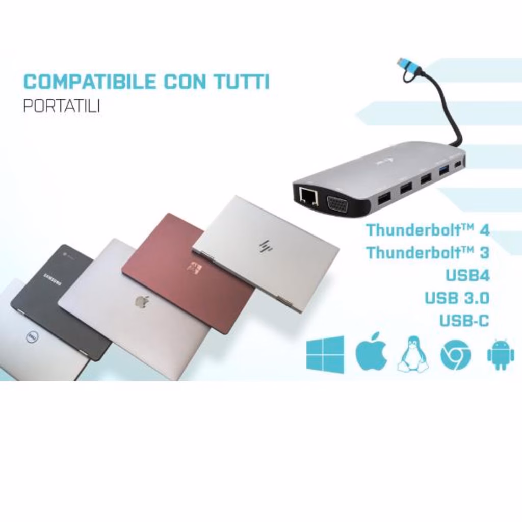 Il dock è compatibile con quasi tutti i laptop attuali (si collega tramite porte USB 3.0, USB-C, USB4 o Thunderbolt 3/4).