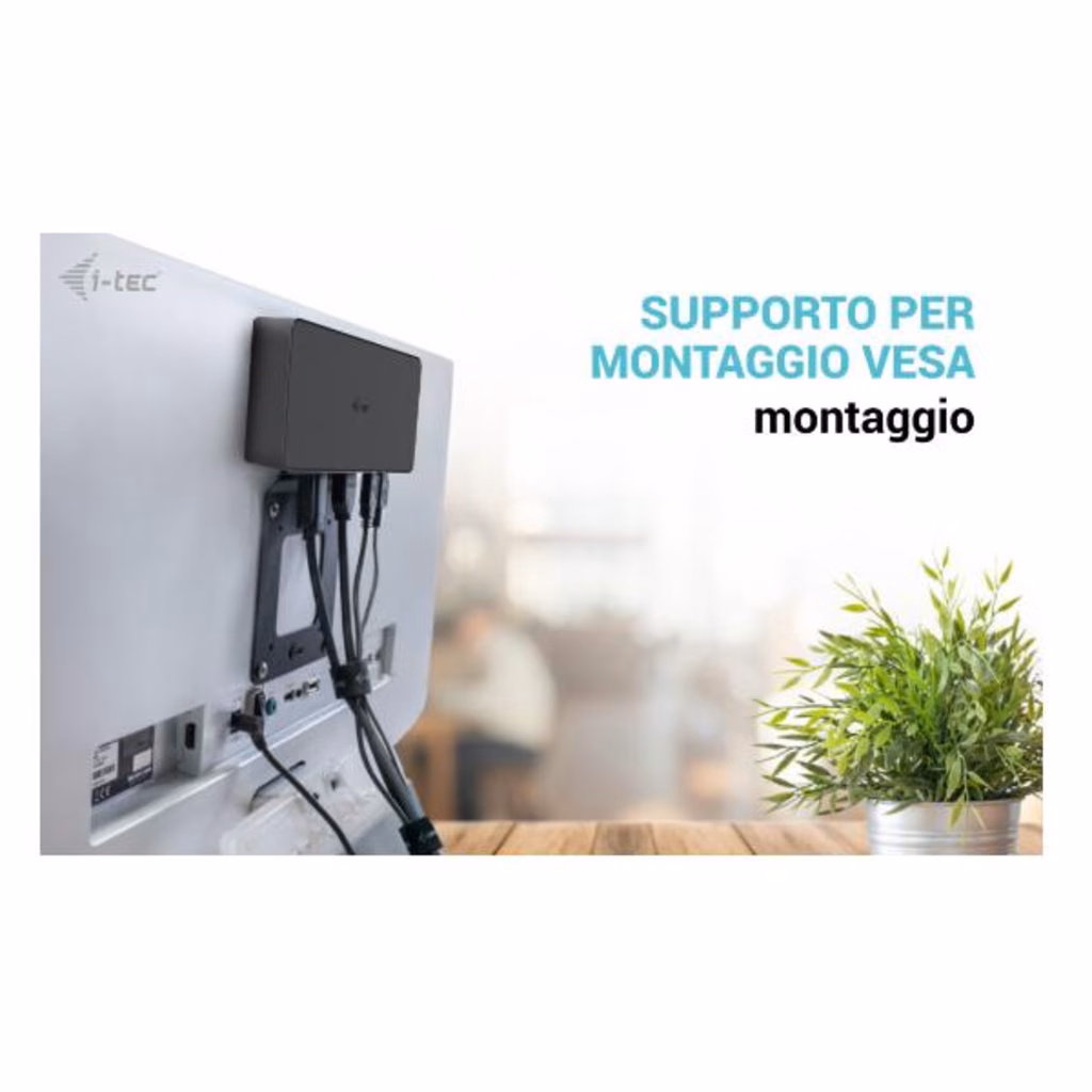 Specifiche tecniche: 1x porta USB-C per il collegamento al dispositivo host con porta USB-C o USB-A (il cavo USB-C e l adattatore da USB-C a USB 3.0 sono inclusi) Tecnologia della docking station: DisplayLink + USB-C PD Consegna di energia: 96W Porte video: 2x Display Port (supporto DP++) 2 HDMI Risoluzioni supportate: 1 monitor 1x DP ? fino a 4K/60Hz 1 monitor 1x HDMI ? fino a 4K/60Hz 1 monitor 2x DP ? fino a 5K/60Hz* 2 monitor 1x DP + 1x DP ? fino a 2x 4K/60Hz 2 monitor 1x DP + 1x HDMI ? fino a 2x 4K/60Hz 2 monitor 1x HDMI + 1x HDMI ? fino a 2x 4K/60Hz 1 porta USB-C 3.2 Gen 2 (solo dati), BC 1.2 1x porta USB-C 3.2 Gen 2, PD 20W 1x porta USB 3.2 Gen 2, BC 1.2 1 porta USB 3.2 Gen 2 3 porte USB 3.2 Gen 1 1 porta Ethernet GLAN RJ-45 (DisplayLink DL-6950) 1x porta audio combo da 3,5 mm, che supporta la frequenza di campionamento e la registrazione di alta qualità a 32 bit/192 kHz 1 ingresso di alimentazione (DC 20V/7,5A) Clonazione dell indirizzo MAC: Sì (utilizzando il software i-tec Docker Pro) WOL: S1, S2, S3 Interruttore On/Off per accendere e spegnere la docking station Indicatore LED Supporto per il blocco Kensington Supporto per il montaggio VESA (codice VESADOCK1) Cavo USB-C con adattatore da USB-C a USB-A (100 cm) OS: Windows 10 / 11, macOS, Android 5 o successivo, Chrome OS R51 o successivo, Linux Ubuntu Facile installazione del driver (Windows, MacOS, Ubuntu, Android (external link)) Dimensioni del prodotto: 190x88x37 mm Peso del prodotto: 539 g Dimensioni della confezione: 253 x 200 x 54 mm