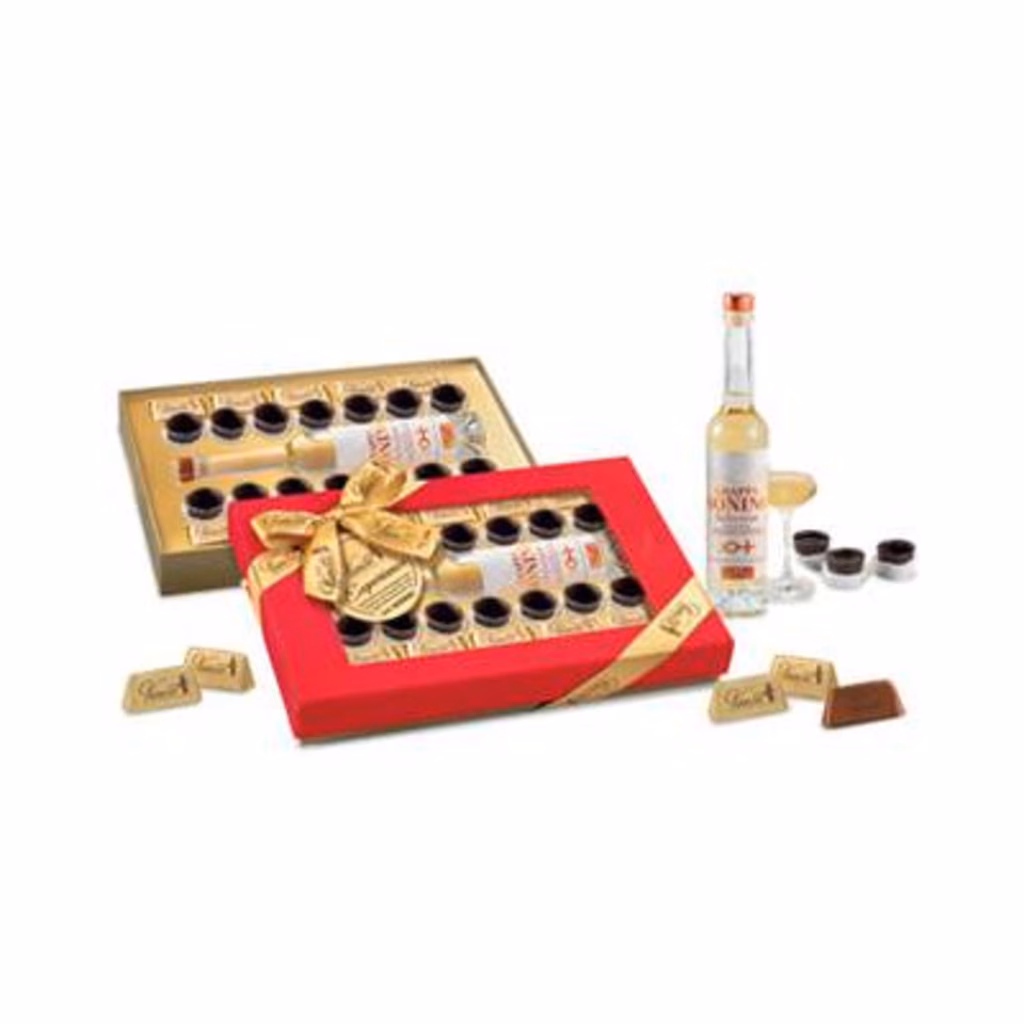 Esclusiva confezione Experience in velluto rosso con fiocco - 1 Grappa Nonino Selection 41% vol - 100 ml - 2 confezioni da 7 bicchierini di cioccolato fondente Vanoir 45 g - Gianduiotti 30% Nocciola Vanoir 100 g