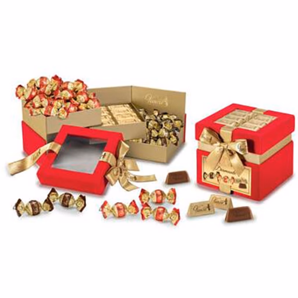 Elegante scrigno portagioie Diamante a 3 scomparti in velluto rosso con fiocco - Boules ripiene crema di nocciole Vanoir 150 g - Boules cioccolato fondente 72% Vanoir 150 g - Gianduiotti 30% Nocciola Vanoir 80 g