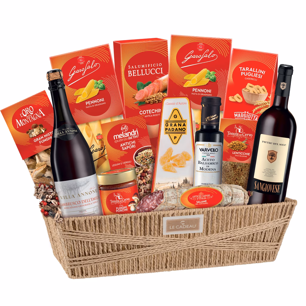 Vassoio serigrafato Goloso - Bottiglia vino Sangiovese IGT Rosso Pietre del Sole 11% vol - 750 ml - Bottiglia vino Lambrusco Villa Annone IGT Contri 10% vol - 750 ml - Trancio di Grana Padano DOP 140 g - Salame del contadino Antichi Sapori d'Italia 100 - Bottiglia aceto balsamico di Modena IGP LAceto Reale 250 ml - Scatola cotechino cotto Bellucci 250 g - Confezione lenticchie Tenuta del Cervo 175 g - n. 2 confezioni pasta pennoni rigati Garofalo 250 g - Vaso sugo ai funghi porcini Tenuta del Cervo 190 g - Misto funghi secchi Tenuta del Cervo 15 g - Confezione zuppa legumi e cereali Antichi Sapori 200 g - Confezione tarallini classici Margiotta 100 g