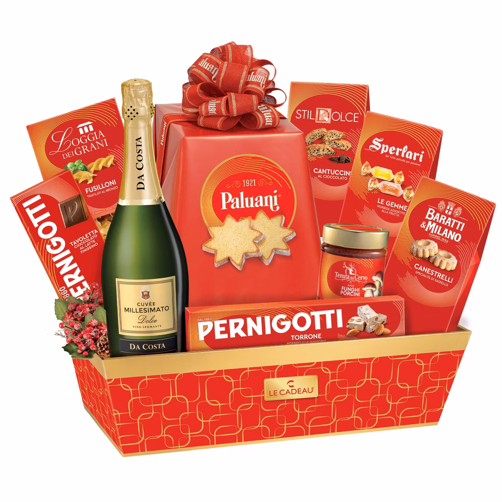 Vassoio serigrafato Gran Galà - Pandoro astucciato Paluani 500 g - Bottiglia spumante Millesimato dolce Da Costa 9,5% vol - 750 ml - Tavoletta cioccolato al latte Pernigotti 80 g - Astuccio torrone morbido alla mandorla Pernigotti 75 g - Confezione canestrelli Baratti & MIlano 80 g - Confezione cantucci al cioccolato Stildolce 80 g - Confezione Gemme morbide gelées alla frutta Sperlari 100 g - Confezione pasta fusilloni Loggia dei Grani 250 g - Vaso sugo ai funghi porcini Tenuta del Cervo 190 g