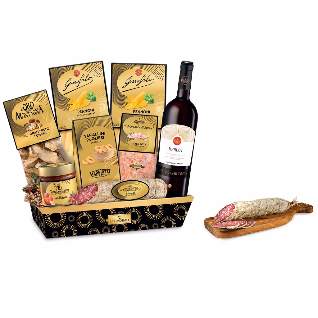 Vassoio serigrafato Sfizioso - Bottiglia vino Merlot Fabio Gartino 11,5% vol - 750 ml - Salame del contadino Antichi Sapori d'Italia 100 g - n. 2 confezione pasta pennoni rigati Garofalo 250 g - Vaso sugo all'arrabbiata Tenuta del Cervo 190 g - Misto funghi secchi Tenuta del Cervo 15 g - Confezione sale rosa dell'Himalaya 150 g - Confezione tarallini classici Margiotta 100 g