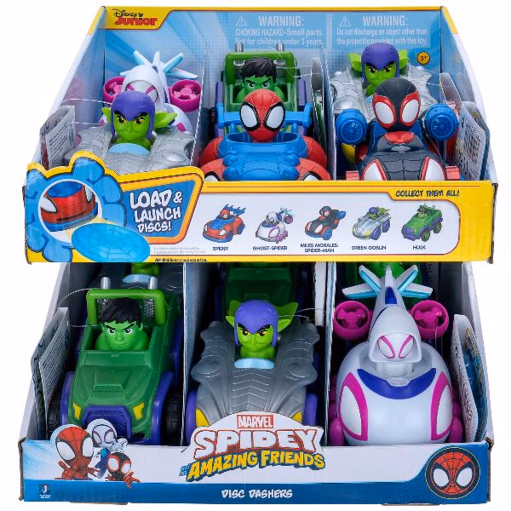 Questa collezione di veicoli Disc Dasher include Spidey, Ghost Spider, Spider-Man: Miles Morales, Hulk e altri preferiti dai fan. Quando c'è un pericolo, ogni Disc Dasher può far esplodere un disco web premendo sulla testa del personaggio per tenere sotto controllo i cattivi.
