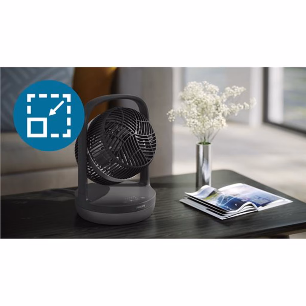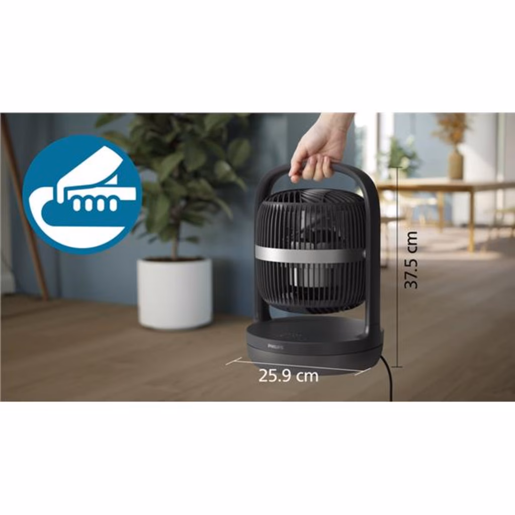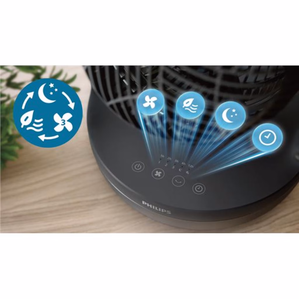 Philips 3000 series Ventilatore da tavolo Serie 3000 CX3050/01, Flusso d'aria 738 m³/h, Ultra silenzioso 23db30% più silenzioso (1) con la tecnologia per lame silentwings Potenza silenziosa. eleganza compatta. Il massimo del raffreddamento al minimo del rumore. Il ventilatore si adatta a qualsiasi arredamento d'interni e raffredda il tuo ambiente senza fare rumore. Personalizza la tua esperienza con 3 velocità, 2 modalità e un timer e, con la testa inclinabile e la funzione di rotazione, godrai di un migliore ricircolo dell'aria.Raffreddamento potente avvertito anche a distanzaFlusso di aria a lungo raggio che può raggiungere fino a 25 metri. Goditi il massimo del comfort e rinfrescati ovunque ti trovi: tutti nella stanza infatti sentiranno la fresca brezza.Ampio flusso di aria per un ricircolo dell'aria nell'intera stanzaUna brezza delicata ti avvolgerà grazie a questo ventilatore con ricircolo dell'aria e un flusso di aria a lungo raggio di 738 m³/h. Niente più aria stagnante: goditi invece una brezza rinfrescante che raggiunge tutti gli angoli della stanza.Raffreddamento 30% più silenzioso, grazie alla tecnologia SilentWingsLa nostra innovativa tecnologia SilentWings assicura un 30% in meno di rumore (1). Ispirandoci alle ali del volatile più silenzioso del mondo animale, il gufo, abbiamo ideato un design delle lame dei ventilatori in grado di raffreddare facendo molto meno rumore, a una velocità di appena 23 dB(A) (2). Praticamente un sussurro!Progettato per durare, con una qualità altamente testataRealizzato per durare stagione dopo stagione. Con oltre 80 anni di esperienza nella cura dell'aria, Philips esegue oltre 110 rigorosi test sui suoi ventilatori a torre prima di metterli in commercio, per accertarne le eccezionali qualità e prestazioni.Notti sempre fresche con la modalità silenziosaGoditi una notte di sonno fresco e tranquillo con la modalità silenziosa. Questa modalità riduce gradualmente la velocità della ventola all'impostazione più bassa consentendoti di addormentarti in modo naturale e risparmiando energia.Modalità Brezza naturale per aria frescaLa modalità Brezza naturale imita l'alito di aria fresca. L'intensità e la velocità dell'aria alternano agevolmente alti e bassi, creando un'esperienza naturale e rinvigorente anche in casa, per tutto l'anno.Comfort personalizzato con modalità versatiliQuesto versatile ventilatore, con 3 velocità, una modalità Brezza naturale e una modalità silenziosa, offre una brezza delicata ma anche un flusso di aria più potente. Scegli tu l'impostazione più adatta alle tue esigenze: rilassati e goditi la frescura.Rotazione automatica per un ambiente fresco in ogni angoloQuesto ventilatore, che si inclina fino a 180° e ruota automaticamente, ti permette una personalizzazione che asseconda le tue necessità, per un flusso di aria rinfrescante esattamente nel momento in cui ti serve, tramite raffreddamento diretto o ricircolo dell'aria per tutta la stanza.Design compatto e modernoCon un design a lame nascoste, che assicurano un aspetto ordinato e minimalista, il nostro ventilatore unisce agevolmente comodità e semplicità. Compatto e discreto, consente di risparmiare spazio senza compromettere le prestazioni.Facile da trasportare e da pulireDesign da tavolo che consente di risparmiare spazio, senza sacrificare le prestazioni. Questo ventilatore pesa solo 2,4 kg, perciò è facile da trasportare e può essere posizionato comodamente su un tavolo o sul comodino per la notte. È progettato inoltre in modo tale da pulirlo con facilità: basta una veloce passata con un panno umido.Risparmia fino a 130 kWh sulla bolletta dell'elettricità per il condizionatoreGrazie al nostro ventilatore, potrai aumentare il termostato del tuo condizionatore di 5° senza sacrificare il comfort, risparmiando al contempo 130 kWh all'anno, vale a dire 35 in meno sulle bollette. Inoltre, è efficiente dal punto di vista energetico, poiché consuma massimo 27W, praticamente meno di una lampadina tradizionale, e 90 volte meno di un condizionatore portatile standard. (3)Organizza le tue esigenze con la funzione timerGoditi un'esperienza di raffreddamento personalizzata con la comodissima funzione timer, che ti permette di pianificare con 12 ore di anticipo.