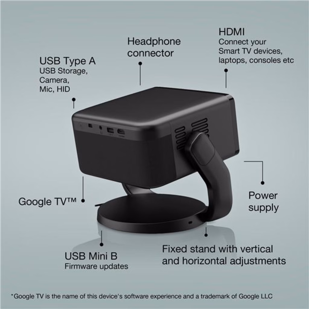 Epson EF-22B Proiettore a raggio standard 3LCD 1080p (1920x1080) NeroThe EF-22B comes with a fixed stand and screen size of up to 150 inches Mini smart laser projection TV Even when the projector is placed close to the wall, supersize your favourite films, games and sporting events at home with a screen size of up to 150" Smart home entertainment See 400,000+* movies and TV episodes all in one place. Google TV brings your favourite content from across your apps and subscriptions and organises them just for you Long-lasting solution With this model's long-lasting laser light source, you'll be able to enjoy entertainment for up to 10 years* Superior picture quality Images appear more vivid and bright with Epson's 3LCD technology, up to three times brighter colours than comparable 1-chip DLP projectors* Legal Statement Complies with The UK Product Security and Telecommunications Infrastructure (Product Security) requirements. Epson will provide security updates until 31/07/29 from purchase. Stylish, mini laser projector This compact projector comes in metallic black and with the adjustable built-in stand, images can be projected in any direction - on a wall, ceiling or floor. The simple usability, setup and portability means you can enjoy entertainment on the go. Bigger is better Create the big screen experience wherever you want with an impressive display of up to 150 inches. With Epson's equally high White and Colour Light Output images are clear, sharp and content is brought to life. Smart home entertainment Everything you stream. All on one screen. Access 400,000+* movies and TV episodes, all in one place. Google TV brings your favourite content from across your apps and subscriptions and organizes them just for you. Ask Google Assistant to find movies, stream apps, play music and control your projector - all with your voice*. Easily cast movies, shows, photos, and more from your phone or tablet, right to your projector with Google Cast*. The built-in 5W Bluetooth speakers can be used with or without a visual display. Long-lasting solution The long-lasting laser light source will provide lower energy consumption, and you'll be able to enjoy home entertainment for up to 10 years*. High-quality, sharp images This powerful yet affordable mini laser projector delivers exceptionally bright yet colourful images with clear details. It's 5,000,000:1 contrast ratio also produces clearly defined shadows and deep blacks. Epson's 3LCD technology means it's projectors have up to three times brighter colours than comparable 1-chip DLP projectors*. Simple set up - plug and play Included technologies such as automatic focus, keystone correction, obstacle avoidance and screen fit mean you enjoy instant entertainment at home or on the go. Simply power on the projector and let it find the best suitable screen size to fit your surroundings.