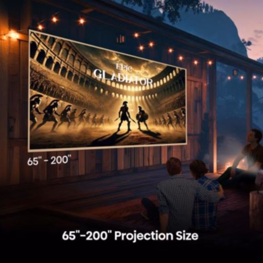 Crea l'esperienza di visione definitiva. Questo proiettore si adatta a qualsiasi dimensione dello schermo, da 65 a 200 pollici, così puoi proiettare su una parete del tuo soggiorno o su uno schermo gigante nel tuo giardino.