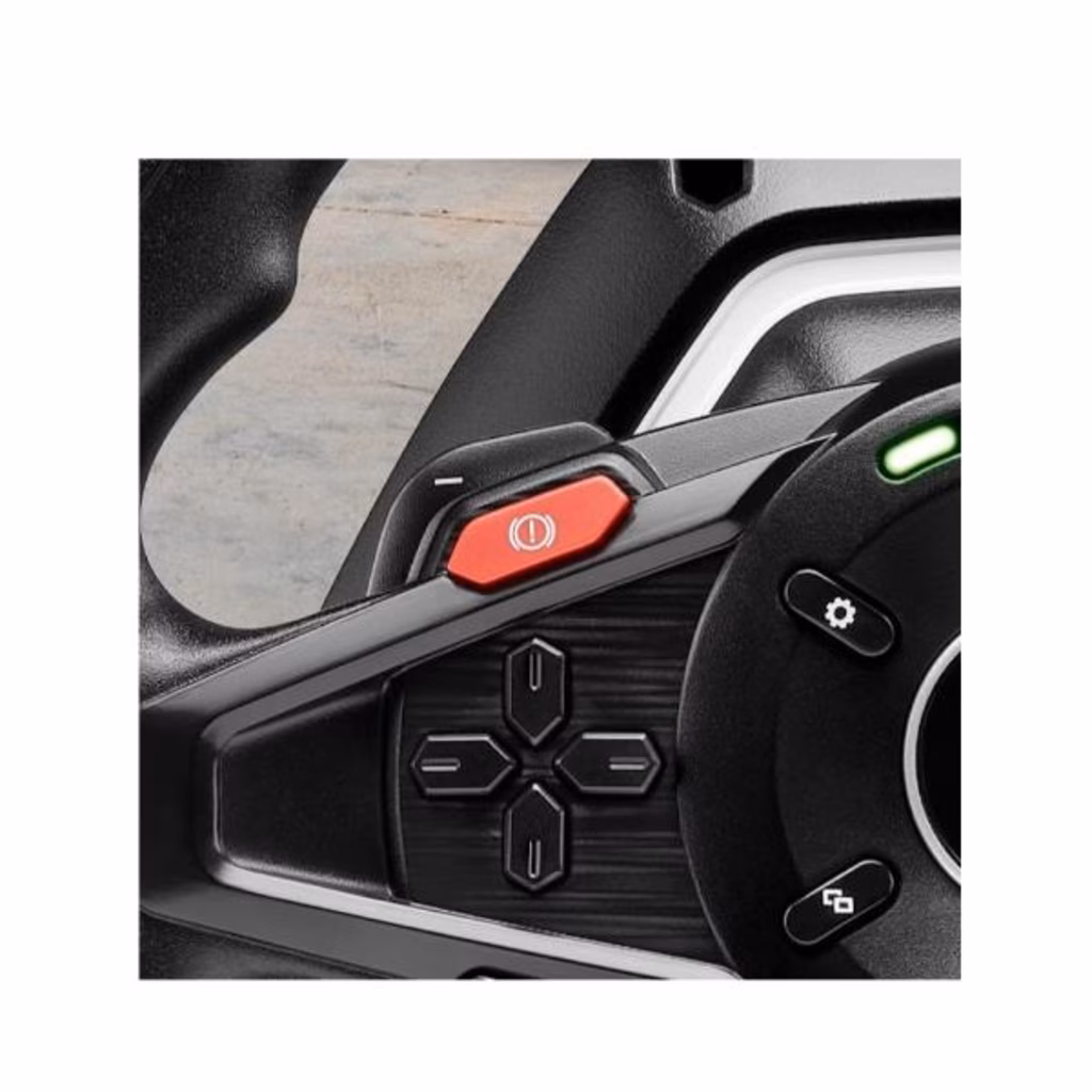 La corona del volante, rotonda e alleggerita, sfrutta al massimo tutta la potenza del sistema Force Feedback, per la massima velocità. Il suo angolo di rotazione, da 270° a 900°, viene regolato automaticamente in base al veicolo utilizzato nel gioco, per una guida sempre adatta a tutti i tipi di veicoli (GT, rally, F1, truck). Grazie ai 13 pulsanti azione presenti sul volante, non sarà necessario utilizzare un gamepad.