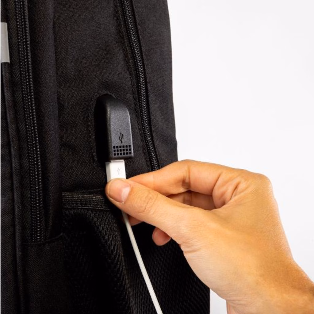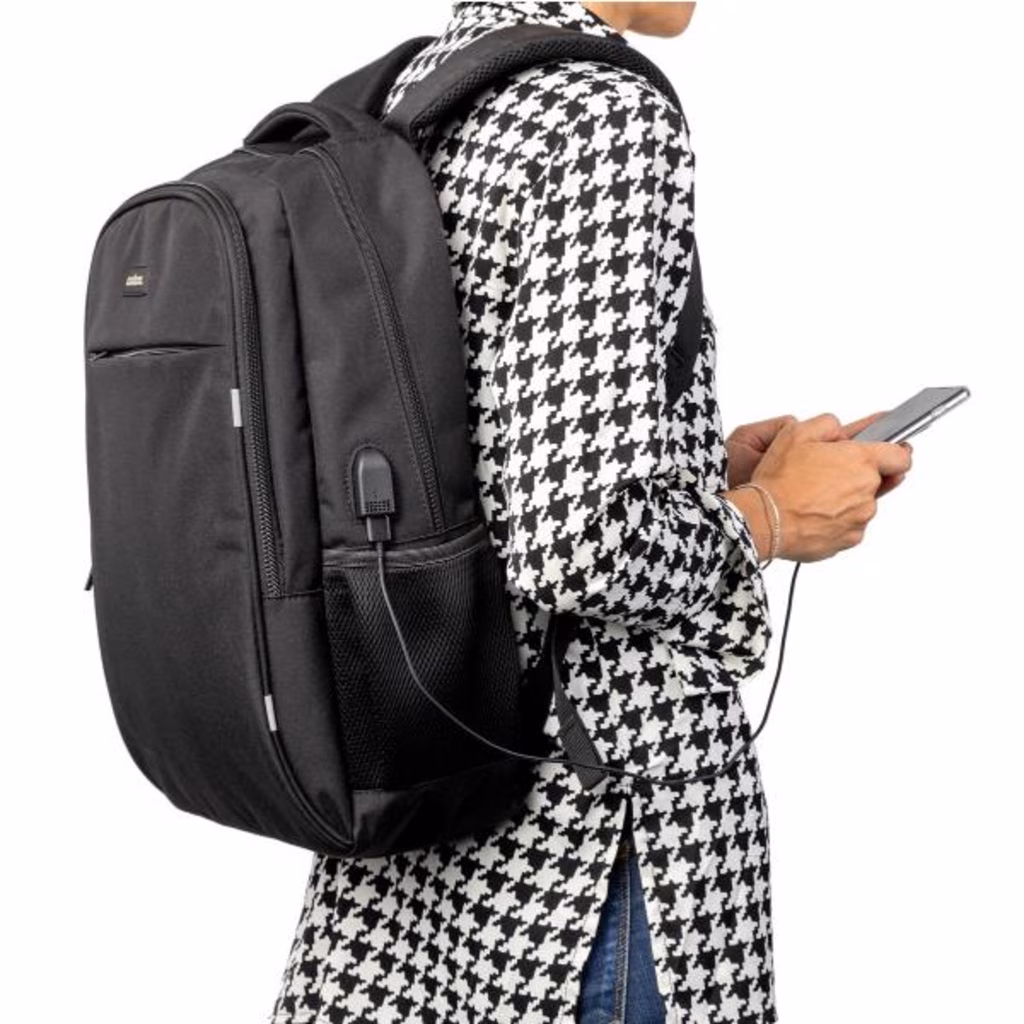 Zaino per laptop fino a 15,6 "di colore nero. I suoi ampi scomparti ti permetteranno di trasportare il tuo laptop e tutti gli accessori di cui hai bisogno in modo ordinato. Carica il laptop senza rimuoverlo dallo zaino. Grazie ad una tasca tecnica, puoi riporre l'alimentatore e allo stesso tempo caricare facilmente il tuo laptop attraverso il foro del passacavo. Schienale rinforzato per un maggiore comfort durante i tuoi viaggi.