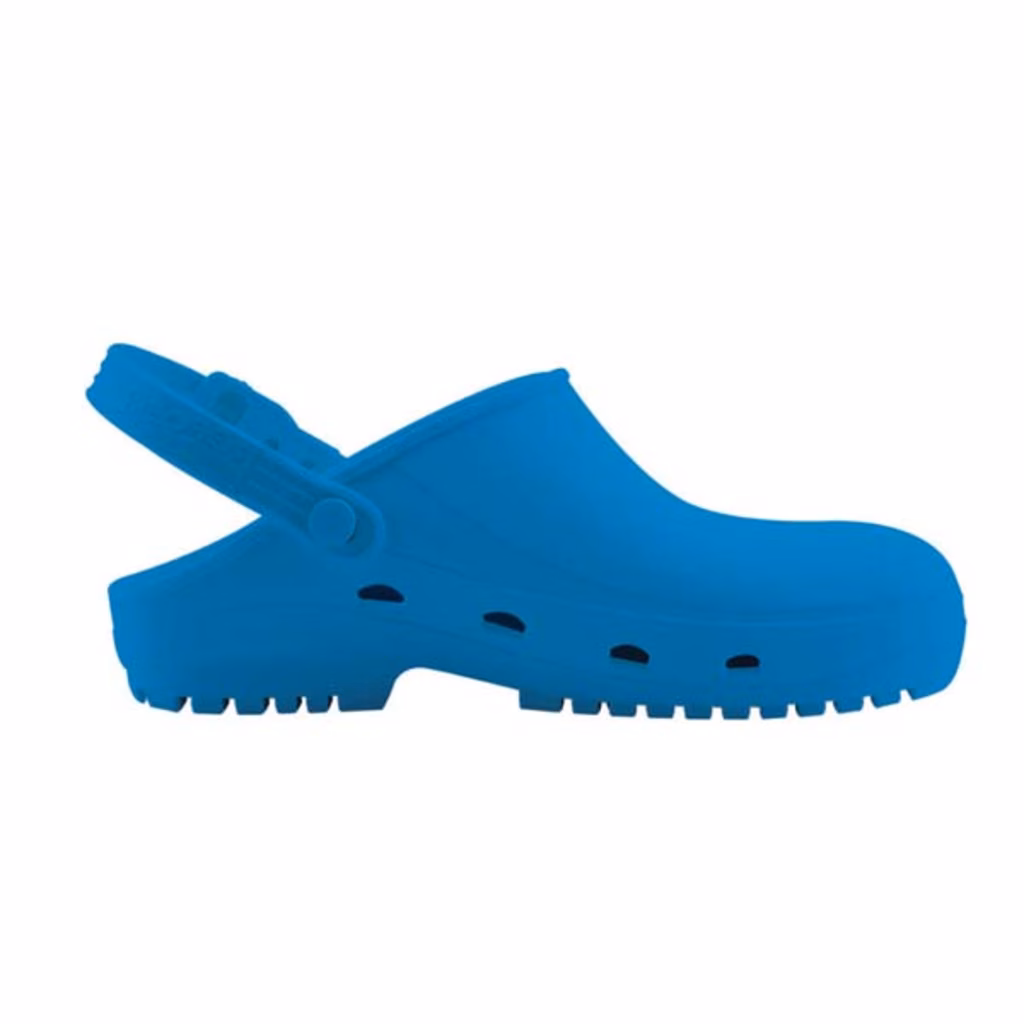 Zoccoli antistatici con tomaia in materiale termoplastico resistente alle alte temperature - idrorepellenti - calzata ampia - fori laterali di aerazione - plantare anatomico - cinturino regolabile - sterilizzabili in autoclave a 135 °C e lavabili in lavatrice